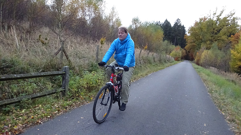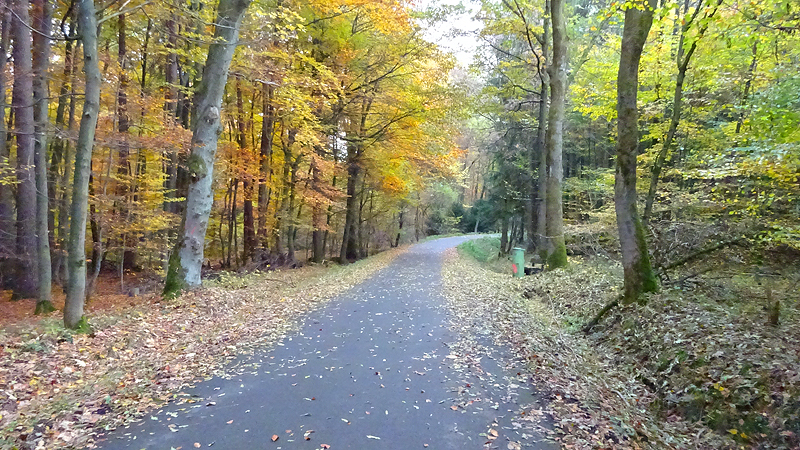 De weg is een beetje glad omdat er kennelijk een vrachtwagen (voor de bomenkap) overheen is gereden. dat loopt niet ideaal maar vooruit maar. Mooi is het gelukkig wel en voor de fiets is het ook goed te doen. We zijn verrast dat deze Schwalbe Marathon banden het toch redelijk goed doen op dit terrein.