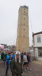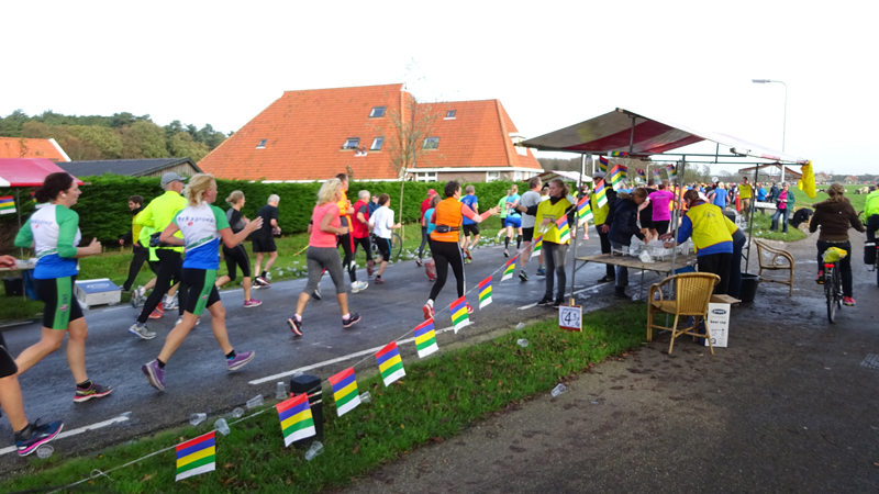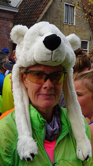 Ik zie S. al snel langsfietsen en tot mijn verwondering heeft hij de gekke berenmuts op die we ooit in Aken op de kerstmarkt kochten. Wat leuk en.. wat herkenbaar nu! Ik zie vanaf nu elke keer vanuit mijn ooghoek ergens die beer en kan S. dus ook makkelijk vinden. Ik pak ergens een softflask aan voor 3 slokjes water en later bij de strandopgang neem ik 2 slokken chocomel tijdens het lopen. De bekertjes van de organisatie vind ik heel lastig om uit te drinken. Moet ik dus een keer oefenen denk ik (of niet). Ik verbaas me weer over de gigantische troep die alle bekertjes maken overal. De sponzen die erg welkom zijn, liggen ook overal. Ik weet wel dat het wordt opgeruimd, maar ik snap nog steeds niet waarom het geen cupless event wordt.