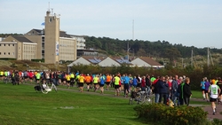 Om 6.15 komt Douglas weer aanrijden met zijn taxibusje en doen we de fiets in zijn taxi. Ik rijd achter het busje aan en zo rijden we eerst naar Musselburgh. Daar zullen we de auto weer trachten kwijt te raken bij het sports centre en vanaf daar zullen we dan weer naar Edinburgh rijden waar de start zal zijn van de run.