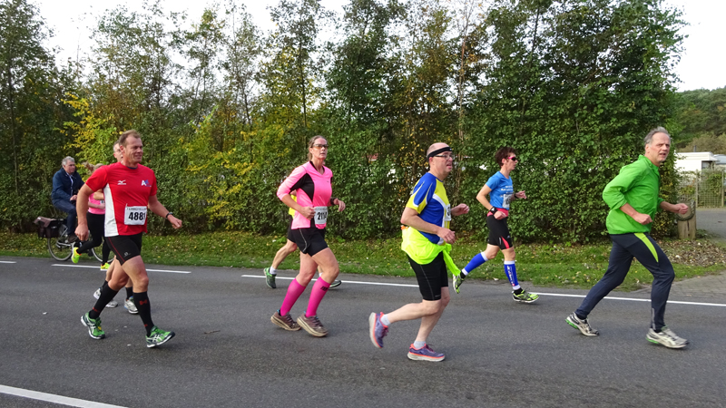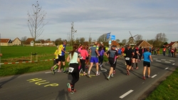 Nu gaat het toch wel opschieten. Inmiddels staan er ook wat mensen langs het parcours. Dat interesseert mij dus niets moet ik bekennen maar de rest van de route is wel erg stil. De route gaan langs de racecourse en daarna richting de rotonde en verder oostwaarts. Voor me loopt ineens een jongeman die dit allemaal erg makkelijk doet en iemand aan het hazen is. Hij roept naar iedereen, maakt high fives en stelt zich vreselijk aan. Eigenlijk is het wel grappig. Als je dit zo makkelijk kunt, snap ik het misschien ook wel. Voorheen zou ik me ergeren aan de man. Nu zie ik het als mogelijkheid om even aan te haken. Ik volg de dame en haar haas een stuk maar tot mijn ergernis moet ik ze na een kilometer toch laten gaan. Ik doe echt enorm mijn best maar het gaat niet zo makkelijk en niet zo snel. Het stuk hier loopt een beetje op en neer. Het stelt weinig voor maar het is geen biljartlaken. De stukjes die naar beneden gaan voegen geen snelheid toe maar de stukjes omhoog halen wel het tempo eruit. Denk aan je houding, denk aan de cadans. Mijn cadans meter zit op mijn schoenen thuis dus ik heb geen idee wat ik heb gedaan. Maar ik probeer er op te letten omdat het echt uitmaakt. Ik voel me een bonkende kamerolifant. Ik reken en reken nog verder. 2.15 moet toch lukken of niet? Waar is het keerpunt nou eigenlijk? Dat is hier toch ergens? Een stuk verderop is dan inderdaad eindelijk het keerpunt.