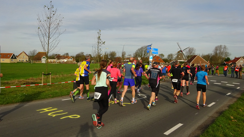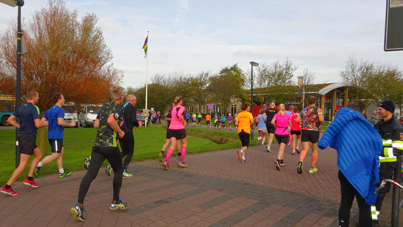 Nog een klein stukje…. even tot het keerpunt en dan terug naar de racecourse en de finish. Straks loop ik de andere kant op en dan zal ik de wind tegen hebben dus dat moet lekker lopen.