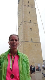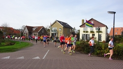 Langs de zee liggen de 10 km matten. Ik loop nog steeds! Ik ben niet eens ontevreden over de tijd. Ik reken wat en reken nog eens. Rond 2.15 zou ik moeten kunnen redden denk ik. Dat is een stuk beter dan vorig jaar maar nog steeds langzaam natuurlijk. Maar vorig jaar was het na de 10 km matten over (door de warmte denk ik). Ik ben toen gaan wandelen en deed 8 minuten over de 11e kilometer. Nu hobbel ik rustig door. Verder langs de zee waar een frisse zijwind staat. De zon laat zich nog steeds niet zien. Gelukkig maar want dat kan ik er niet bij hebben nu. Ik moet doorlopen.