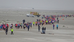 Mijn afgetrapte trail schoenen blijken geen goede keuze te zijn op dit wegdek. Ik voel me bijna vastplakken aan de weg. Domme keuze maar ik kan er niets aan veranderen nu. Op het strand heb ik er vast plezier van en op de longway zal het ook wel prima lopen neem ik aan (dat klopt ook). De eerste 5 km zijn te snel gegaan eigenlijk maar ik zie het wel.