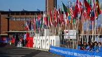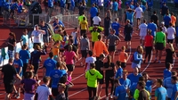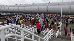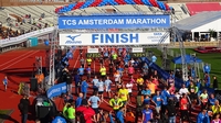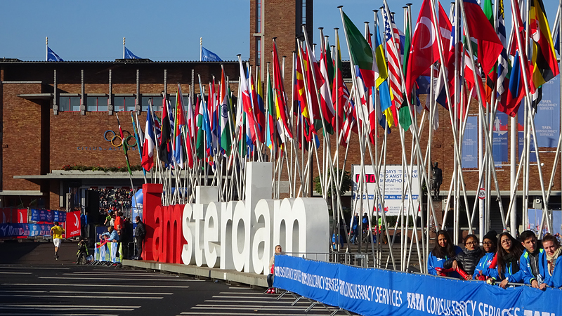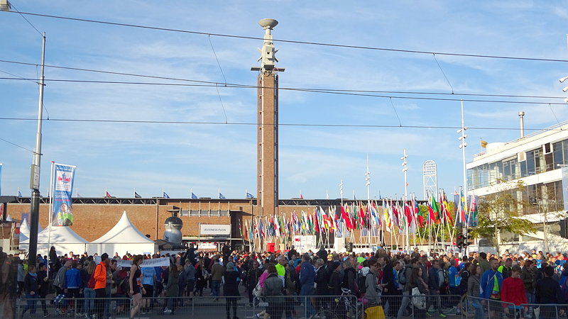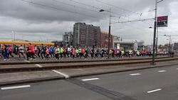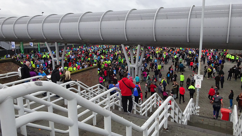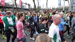 Daarna wandelen we richting de start. Het is hartstikke druk overal echt idioot. Uiteindelijk staan we in een rij richting het stadion maar we schuiven maar niet op. We horen zelfs dat de deuren zullen gaan sluiten. Wat een gedoe. Achteraan starten is prima maar dit is wel hee vreemd. We kiezen een andere rij en dringen ons op een of andere manier toch naar voren en zijn dan eindelijk in het stadion en in ons startvak. Er vertrekken nog steeds waves maar we hoeven niet al te lang te wachten. Chris wil wachten. Ik begrijp niet waarom we niet gaan want we lopen al heel langzaam, starten al achteraan en voordat we het weten worden we ingehaald door de bezemwagen en opruimwagens. Maar goed, het is haar run dus ik schuifel mee.