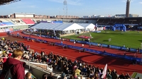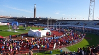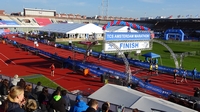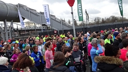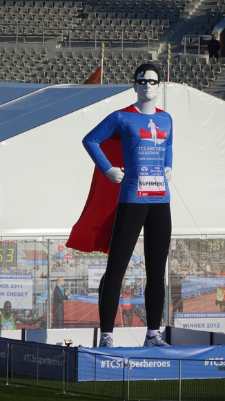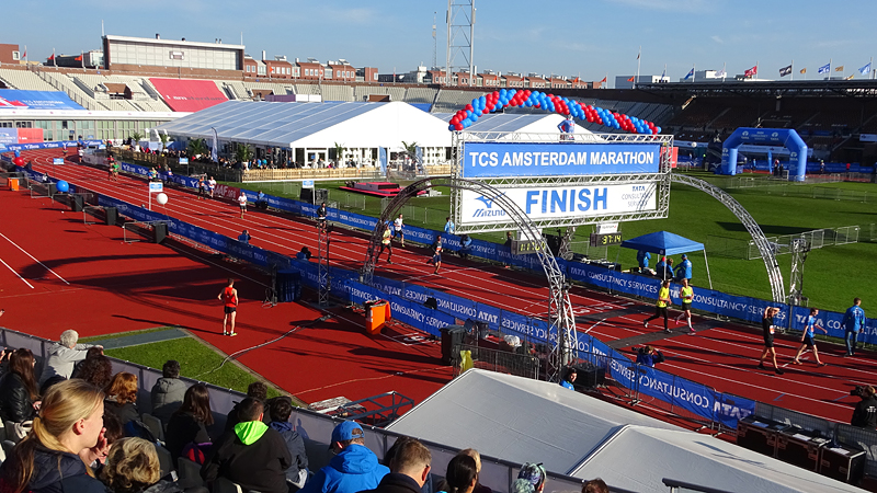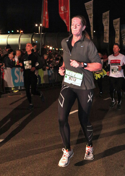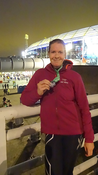 Daarna dan toch echt richting stadion. Maar dan gaat het ineens langzaam. Chris is totaal ingestort volgens mij want het schiet niet meer op. En we wachten en wachten…. en wachten nog meer. Brrrrr ijskoud heb ik het en ik word stijf van die bankjes in het stadion. Maar uiteindelijk komt ze gelukkig toch goed binnen. Helemaal geen gekke tijd en dat komt denk ik vooral door het begin. Samen lopen gaat nu eenmaal beter. Ik voel me wel een beetje schuldig eigenlijk want als ik de hele run had kunnen doen had ze een geweldige tijd gehad denk ik. Misschien volgend jaar dan of een andere keer. Moet lukken.