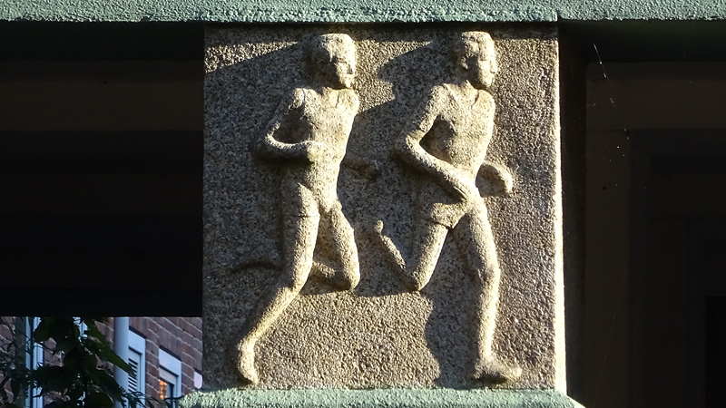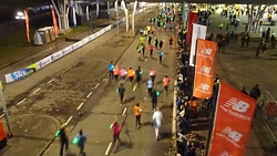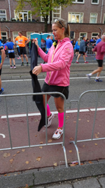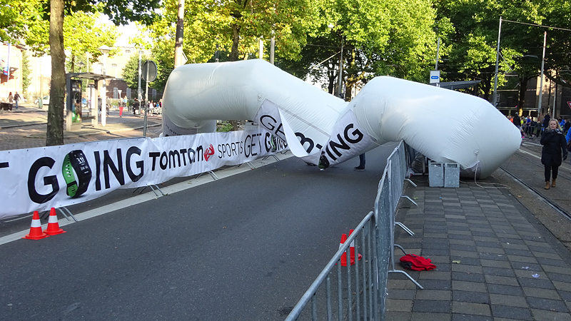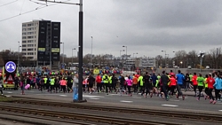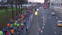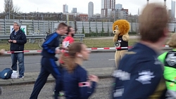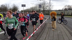 Om 15.30 start de eerste golf en tien minuten laten mag ik dan eindelijk vertrekken. Meteen hoor ik al het getingel van de RWR alert dus ik moet even rommelen met mijn horloge maar die is daarna meteen stil. Heb ik toch echt alles ingesteld, vergeet ik de RWR uit te zetten! Ik ken inmiddels het parcours goed. Ik houd al links aan omdat we meteen naar links afbuigen en daarna rechtsaf zullen slaan. Dat stukje is nieuw. Bij het begin staat iemand in een leeuwenpak mensen aan te moedigen. Ik vind het wel grappig en aan het einde zal de leeuw er weer staan en mensen aanmoedigen. Hij is vast vermoeider dan de lopers! Meteen in de bocht flikkert er al iemand languit op de grond omdat hij blijft hangen achter een pootje van een dranghek. Gelukkig staat de man weer meteen op en loopt door. Ik kijk dus verder maar goed uit want overal staan die krengen!