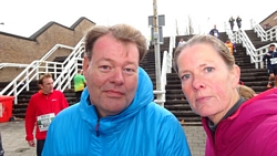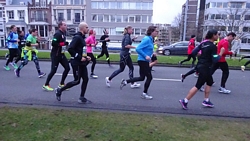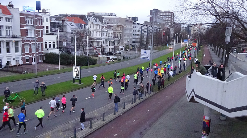 Inmiddels loop ik op de boulevard. Ik vind het niet te harden en krijg kippenvel. Dat is dus niet de bedoeling. Ik besluit door te lopen tot de 10 km matten. Daar ga ik overheen op 60 minuten. Nog steeds op schema maar al minder snel dan vorig jaar. Maar dat is op zich prima want vorig jaar was het 10 graden dus optimale omstandigheden bijna. Maar even na de matten heb ik het zo warm dat ik besluit om even af te koelen. Dit werkt niet en het is maar een runnetje. Ik heb lang nodig om af te koelen.