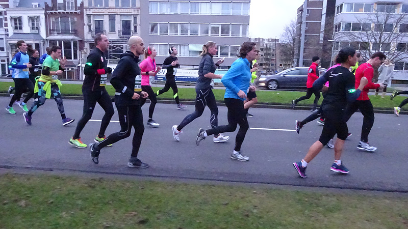 De route is nieuw maar ik zie er geen zak van. Ik probeer te lopen en ergens aan te haken. Grappig dat er zoveel gedachtes door je hoofd gaan tijdens het lopen. Let op de houding, handen en vingers normaal. Ademhaling, cadans en tempo. Niet te snel want ik wil per se continu proberen. Rustig aan en ook niet vallen in de drukte.