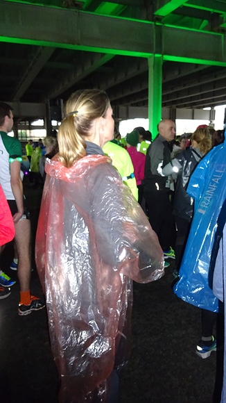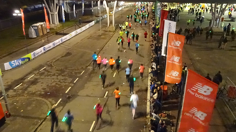 Het startvak is heel groot en het is rustig. Geen geduw en ruimte genoeg ondanks de 12.000 lopers die dit jaar van start zullen gaan. Daarna begint het grote wachten. Er is kerstmuziek en veel lopers hebben hun lampje al om de arm en aan. Dat staat wel feestelijk moet ik bekennen. Mijn lampje zit om de arm van S. omdat we vergeten zijn dat hij in het donker op de fiets zit. Niet zo handig natuurlijk.
