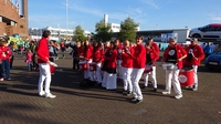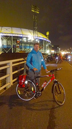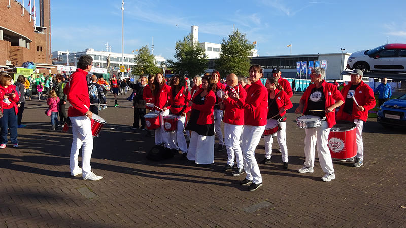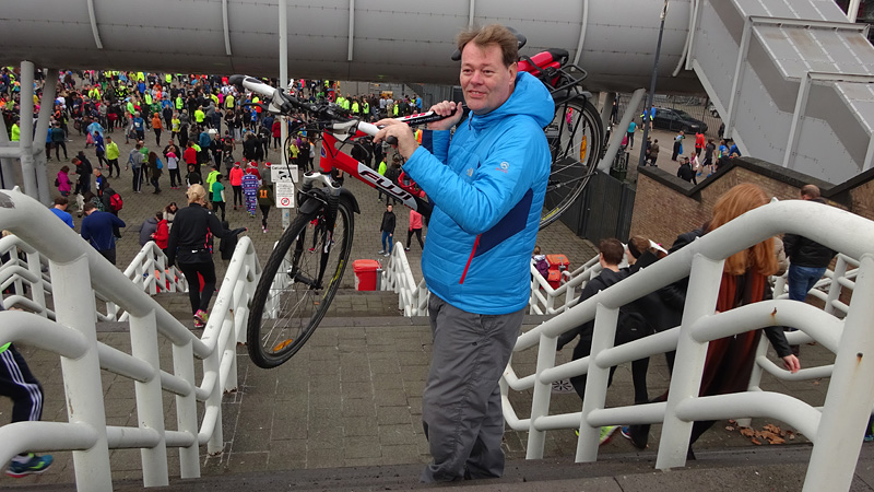 Rond 14 uur vertrokken we richting Rotterdam omdat we nog weten dat het parkeren niet echt makkelijk is in Rotterdam. Dit jaar is het nog niet heel druk op de Brienenoordbrug en we kunnen redelijk doorrijden. De windvaan staat trouwens redelijk goed qua richting dus dat valt misschien straks mee. Parkeren gaat ook goed en daarna wachten we even rustig in de auto. Het is droog en het is wel leuk om naar alle andere lopers te kijken. Wat hebben ze aan? Hoe zien ze eruit? S. haalt alvast de fiets van de auto en rond 15 uur gaan we op weg naar het stadion.
