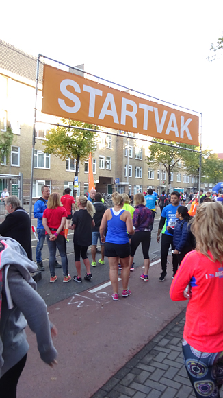 We lopen meteen langs toiletten die enorm druk zijn. De klokt tikt vrolijk door en pas om 7.50 kom ik er weer uit en trek ik gauw mijn broek uit, doe mijn schoenen normaal aan en doe mijn jasje uit. S. heeft een tasje op de fiets met kleding voor na de run en een softflaskje en de spons. Ik ben blij dat ik gisterenavond dan verder alles al gedaan had. Dextro in mijn rokje, zakdoekje in mijn shirtje en de spons al netjes met wat water in een afgesloten zakje. We hoeven nu gelukkig niks meer te doen want er is ook helemaal geen tijd meer voor. Snel spelden we het startnummer op en dat is het dan. Gauw naar de startvakken. Gelukkig zijn we echt vlakbij afgezet en ik duik het blauwe vak in waar ik ben ingedeeld. Vlak daarna begint het lange lint zich al in beweging te zetten richting de start. Ondertussen zet ik mijn horloge eens aan. Ik loop met de 610 omdat mijn 910 kapot is helaas en de tweedehands 910 die ik overnam niet goed blijkt te werken. Op hoop van zegen maar, ik heb er al een rondje mee gelopen en ik zet nog snel even de autolap op 5 km en de RWR alert op ‘uit’.
