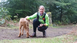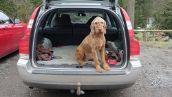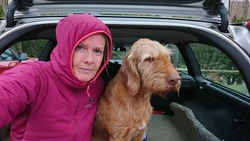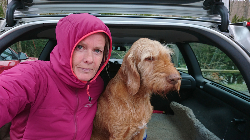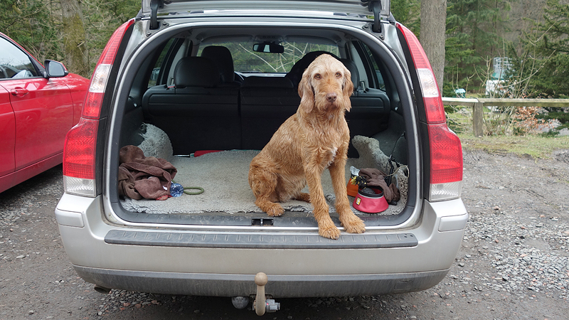 Als ik bij de auto terug kom, moet ik natuurlijk nog even wachten totdat het eten van woef gezakt is voordat we kunnen gaan lopen. Ik ga lekker bij haar achter zitten en samen kijken we een beetje naar de mensen die langs lopen. Maar ik had niet gerekend op de belangstelling voor woef en de aandacht die ze kreeg. ‘What breed is that’? “Oh look how gorgeous’! Zo ging het een tijdje door. Ik ben maar mijn schoenen vast gaan wisselen en de spulletjes en beetje in zakken gaan doen, want woef werd toch wel geaaid daar achterin.