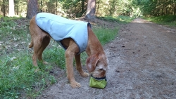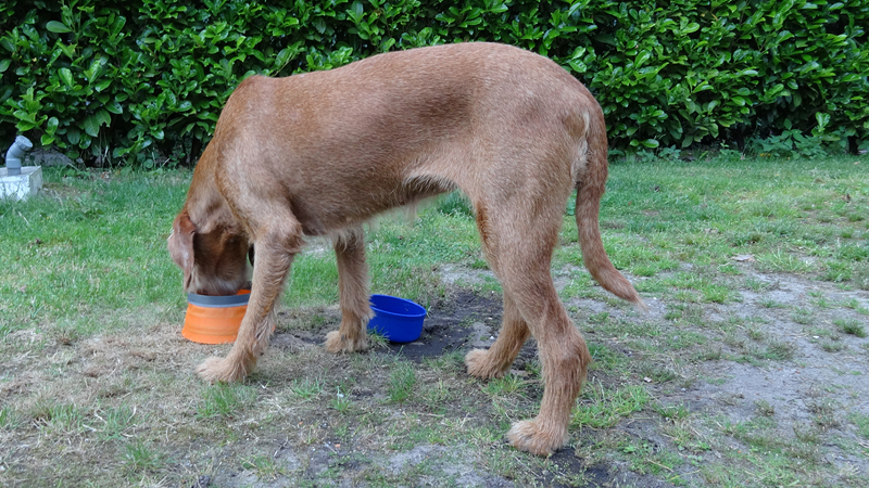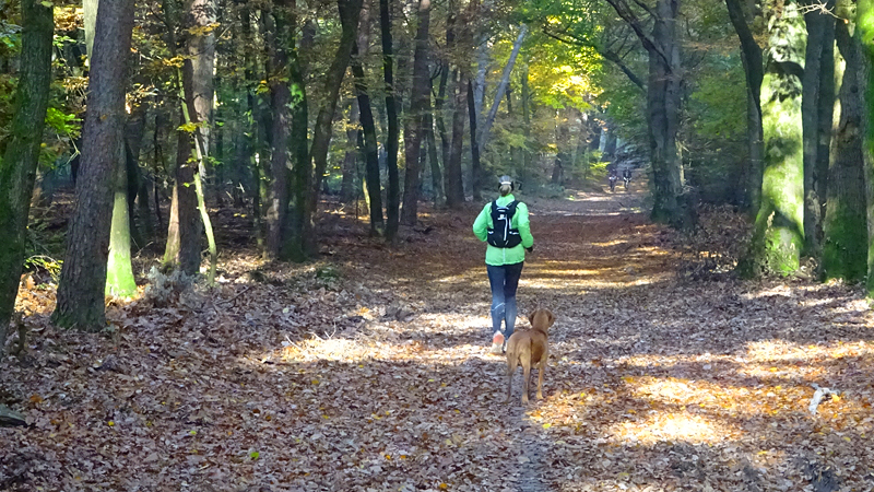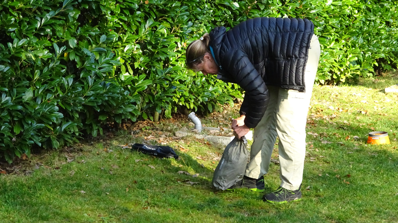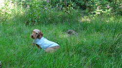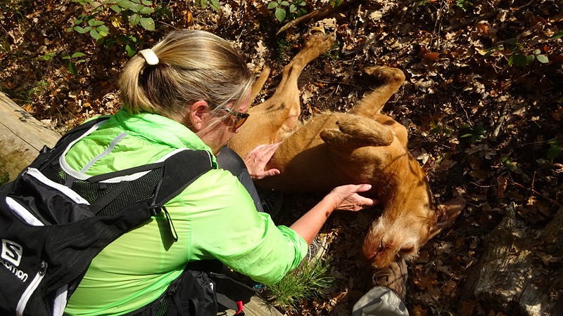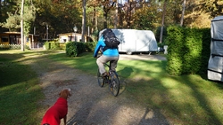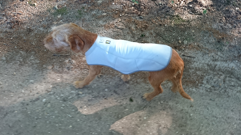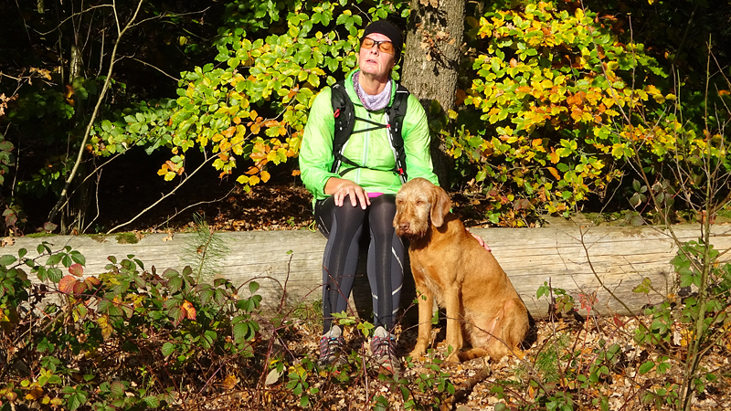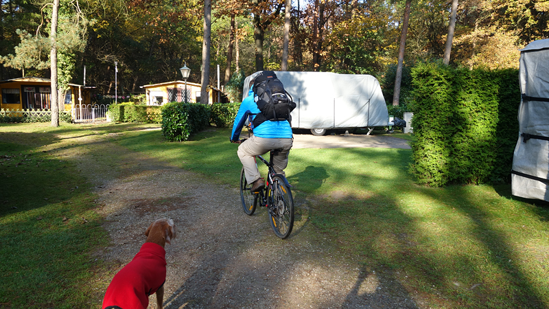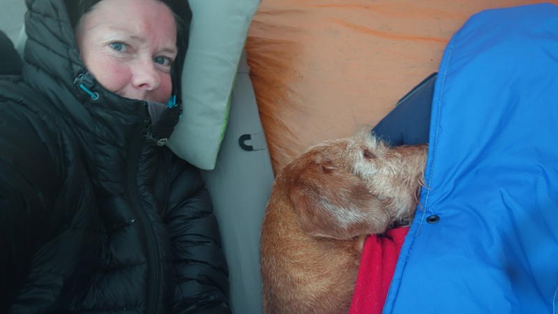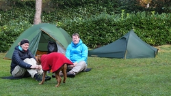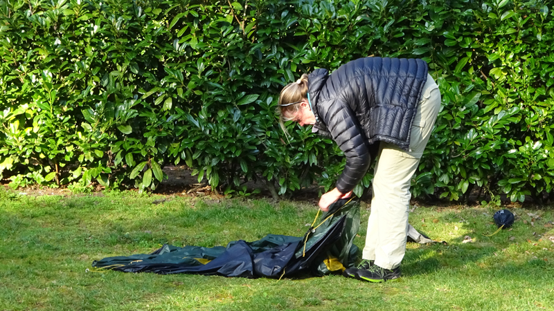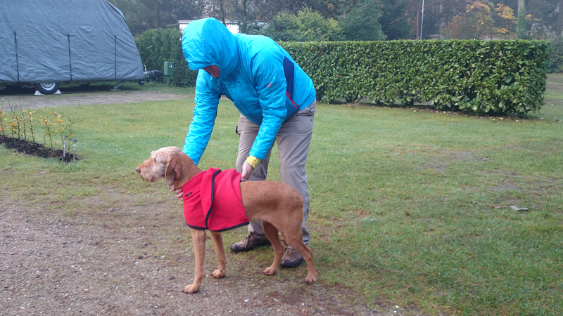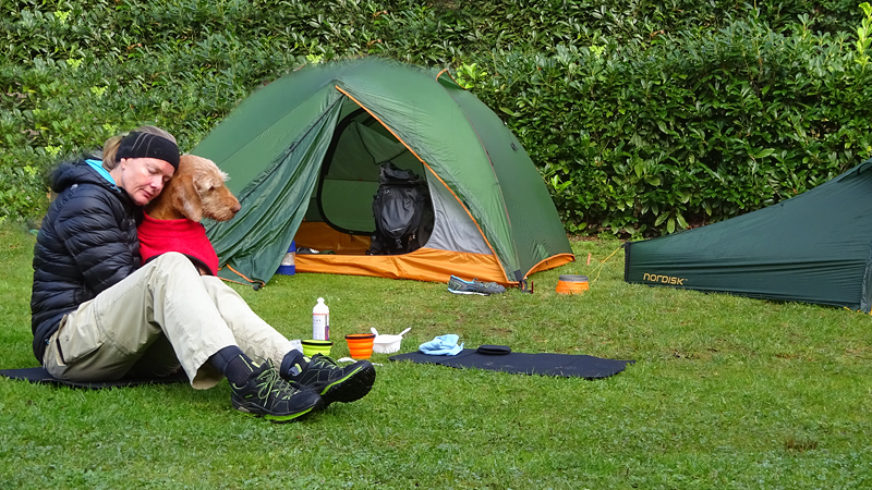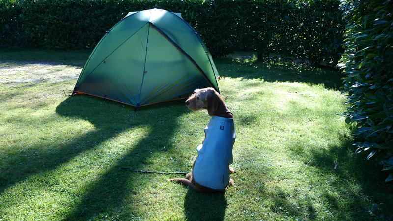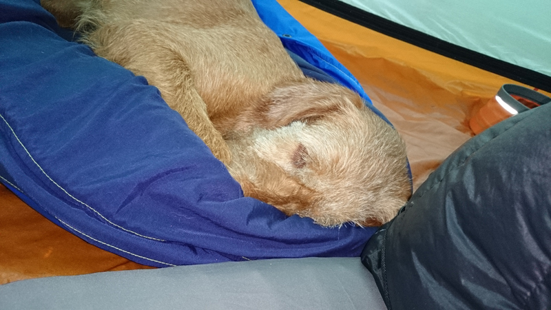 Vannacht ben ik natuurlijk wel enkele keren wakker geweest en door alle thee van gisteren, moest ik ook naar het toilet. Maar even de benen strekken en door een rustige nacht lopen, is ook niet erg. Het was overigens totaal niet koud en (belangrijker) ook niet vochtig. Ik vond het prachtig om de uilen te horen in het donker en de andere roofvogels met hun schelle roep. Vanmorgen begonnen de fazanten al heel vroeg herrie te maken en er scharrelden enkele fazanten rond de tent die met hun kenmerkende klokkende geluiden lekker aan het fourageren waren. Maar zo dommelend is het wel heel fijn wakker worden. Ik heb het overigens geen moment koud gehad en had in de slaapzak alleen mijn dunne Lafuma shirt (lange mouwen) aan. Natuurlijk word je wel totaal verkreukeld wakker……Woef niet, die slaapt heerlijk nog wat door in haar warme Noblecamper en gele tankie.