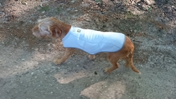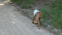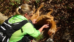 Ineens zie ik twee schapen waarvan een met lammetjes. Een van de lammetjes is nog heel klein en heeft nog een bebloede navelstreng onder zijn buikje hangen en bloedvlekjes op zijn vachtje. Echt nog heel jong! Ik lijn woef even aan omdat de lammetjes nog zo ontzettend klein zijn. Een van de lammetjes blijft liggen en woefje ruikt er eens aan. Mmm lekker! Grapje natuurlijk want ze doet niets. De twee schapen en de lammetjes zijn ook niet onder de indruk van ons.