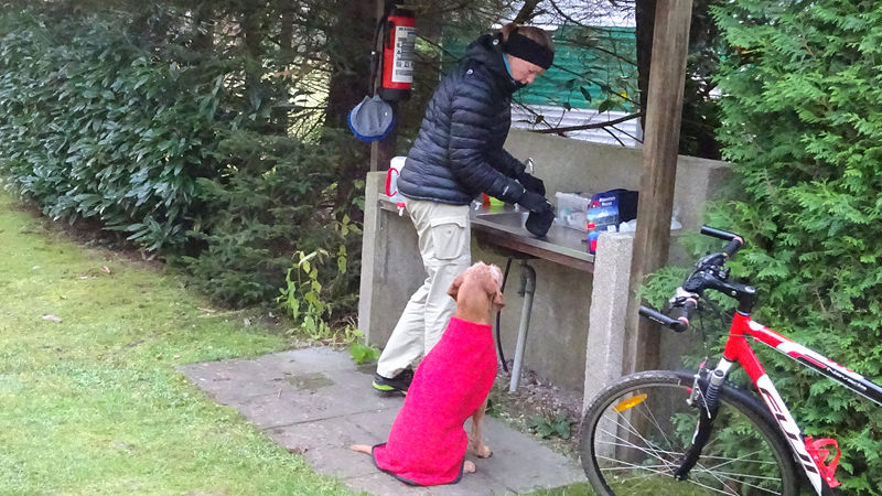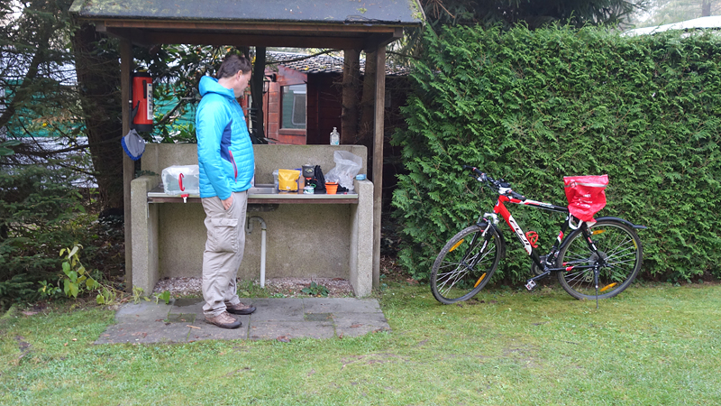 Ik geef woef te eten en loop dan naar het toiletgebouw om me een beetje op te frissen. Ik zou vanaf 8.30 in de pub kunnen ontbijten maar eigenlijk vind ik dat veel te laat. Ik besluit dus straks zelf mijn warme ontbijtje te maken. Eerst ga ik woef uitlaten en als we teruglopen naar de tent, zie ik een rode eekhoorn. Mooi beestje en ik vind het leuk dat ik er inderdaad eentje gezien heb nu, want dat had ik al gelezen in de reviews van anderen. Daarna loop ik terug naar de tent voor mijn ontbijtje. Al snel pruttelt het gasstelletje weer met mijn water en kan ik al bijna eten.