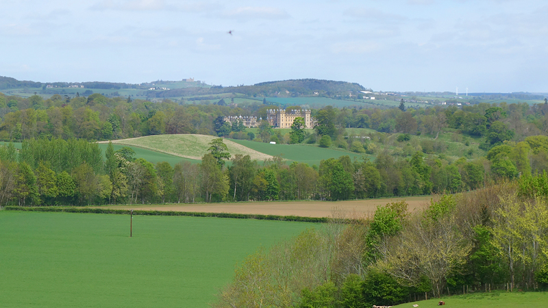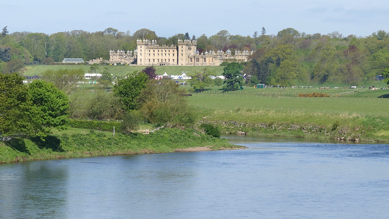 Vandaag is het tot mijn verrassing mooi weer als ik om 7 uur buiten loop met woeffie. Blauwe lucht en weinig wind. Dat lijkt een geschikte dag voor een rondje en om 9 uur zijn we op pad. Gisteren had ik in een boekje al een leuke route gevonden die me deels weer over de BAW van dag 1 zou leiden maar dan de omgekeerde richting op. Dat stukje langs de rivier is ontzettend mooi en dat wilde ik heel graag nog een keer lopen. Bovendien zie je altijd weer iets anders als je een route in omgekeerde richting loopt! De route zou van Kelso eerst langs de abby lopen, over de Rennie bridge daarna langs het water richting Roxburgh Castle en als eindpunt Roxburgh Railway Viaduct. Vanaf daar het water over via die ijzeren brug en aan de andere kant over de oude railway weer terug naar Kelso. Zo gezegd zo gedaan en al snel waren we op weg Kelso weer uit waarbij ik vandaag het uitzicht op Floors Castle vanaf de brug niet miste.