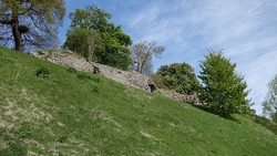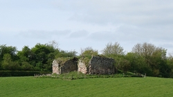 Helaas zijn er niet alleen velden met schapen, maar ook met enge koeien. Ik kom ineens op een veld met alemaal jonge koeien. Gelukkig zonder moeder maar ze zijn blijkbaar net buiten want ze zijn razend nieuwsgierig en komen met z’n allen aanrennen om eens gezellig te kijken. Maar ik vind ze niet leuk. Koeien zijn niet slim en denderen met evenveel plezier gewoon door of over je heen. Woef loopt los want die redt zich wel. In plaats dat ze nou woef doet, laat ze mij het vuile werk opknappen en ik roep van alles naar de dieren en zwaai met mijn armen. Ondertussen rommel ik door het modderige veld met gaten. Heel leuk. Rechts van me staan de resten van een dovecote. Toch even snel een kiekje ondanks de koeien die maar blijven volgen.