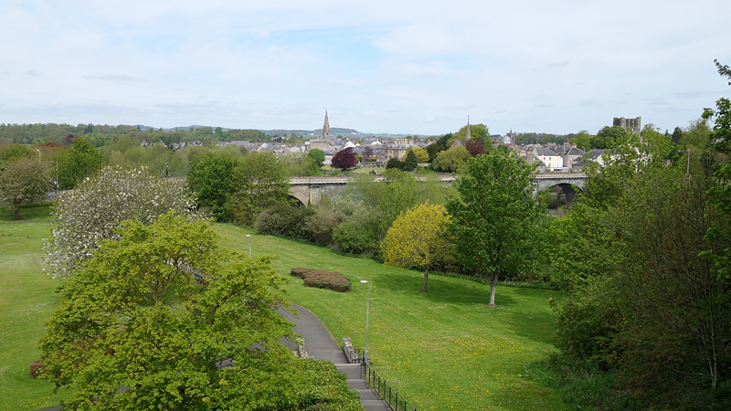 De teller staat al ver boven de 40 km als we over de brug lopen. Best een eind zo voor de eerste dag. Vanaf de brug heb je mooi uitzicht over het water en kelso.