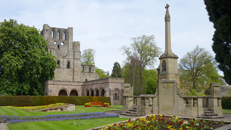Hoewel er pas 23 kilometer opzit en ik dus op de helft ben, voel ik me wel een beetje moe. Ga ik het wel redden om helemaal terug te lopen naar Kelso? Toch moeten we verder want elke reis begint met de eerste stap. Ik ga dus weer op pad en probeer het dorp uit te komen richting de route maar gek genoeg moet ik even zoeken naar de route. Nergens staan bordjes en ik snap er niets van. Gelukkig heb ik een kaart en al snel zijn we weer op de juiste weg het dorp uit. Vanaf daar is er prachtig uitzicht op de abbey. De abbey is uit 1138 en heeft uitzicht over Jed Water.