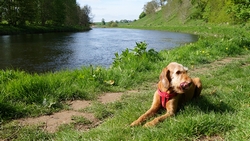 Dan ineens gaat het mis. Het ene moment hobbelen we vrolijk over het gras maar het andere moment kermt en piept woef ineens en staat stil op drie pootjes. Wat nu? Ze blijft piepen en dat doet ze nooit. Kapotte zool? Ik zie een raar gevormde tak op het pad liggen. Zou ze daarop zijn gaan staan of over gestruikeld zijn? Ik ga gauw kijken en bestudeer haar zooltjes. Geen bloed, niks te zien eigenlijk. Ze bibbert van schrik en ik masseer snel alles bij de gekwetste poot. Even tot rust komen, misschien is het alleen maar schrik. Ze is een keiharde maar kan ineens om niks dan enorm mutserig doen. Ik hoop dus dat dat nu ook zo is. Ik heb weliswaar schoentjes bij me, maar daar zou ik nu niks aan hebben want met de zooltjes is niks. Dat zou een heel eind dragen worden vanaf de rivier hier. Maar het kan altijd gebeuren, en ook ik kan ten val komen of iets dergelijks. Maar laten we eens kijken hoe het gaat na de massage….. Ik wandel rustig een stukje en doe alsof alles heel leuk is. Teveel aandacht is ook weer niet handig. Ondertussen loer ik of ik ook maar iets zie van mankheid of pijn. Dat lijkt niet zo te zijn en even later is ze alweer de hort op. Gelukkig! Ik maak ook weer vaart en we zijn weer op pad. Pfeew.