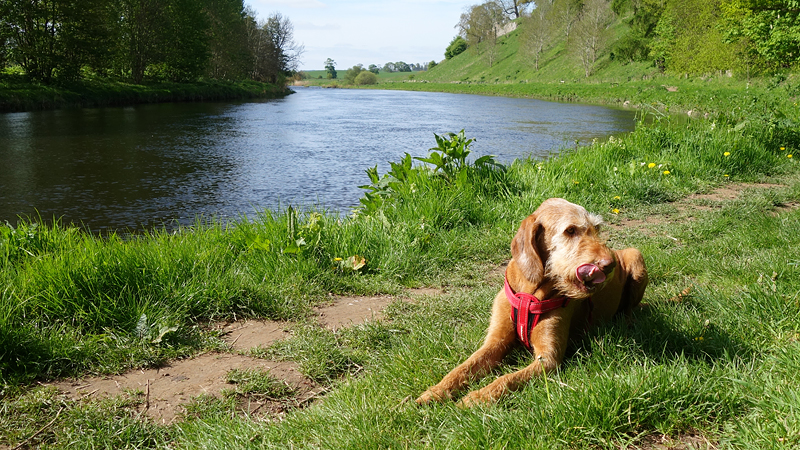 Dan gaat het ineens heel erg snel qua route en afstand. Ik heb wel de caves gemist in de rivier wand. Dat is jammer maar niks aan te doen. Kelso komt inmiddels dichterbij. Ik zie weer zo’n mooie oude brug uit 1795. Ook kom ik iemand tegen met een draadhaar Vizsla. Een echt meisje maar doordat ze nooit getrimd is, lijkt het wel een langhaar. Blijkbaar doen de Engelsen daar niet aan.