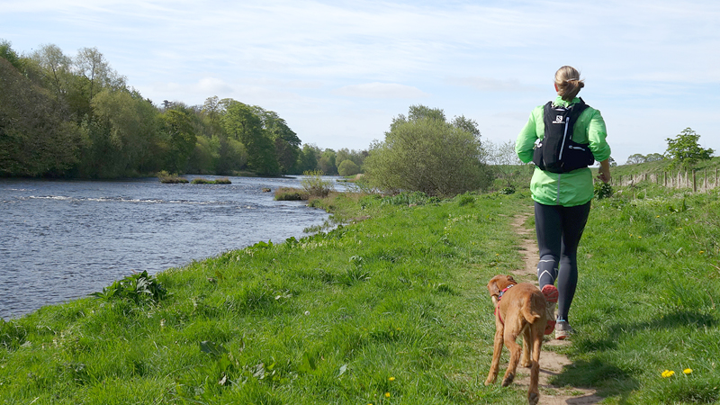 Ik kom langs het water iemand tegen die ook aan het joggen is met 2 honden. We raken aan de praat en het blijkt een nederlandse te zijn die al 20 jaar in schotland woont. We kletsen wat ik vertel over de route en dat deze tweede dag eigenlijk een beetje saai is. Zij kende de BAW niet, maar we de andere routes die vlakbij lopen. Ze maakt een foto van de hond en van mij.