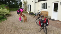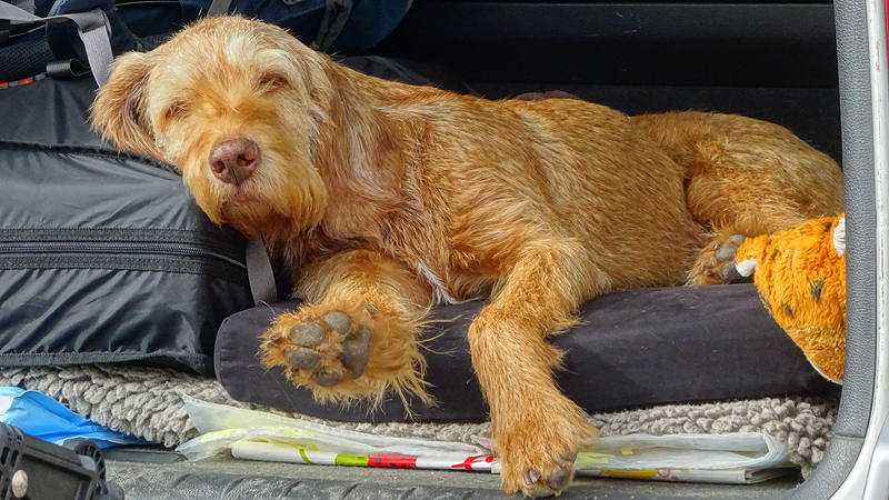 We lopen daarna naar de auto en gaan woef verzorgen. In het heetst van de strijd is S. helemaal vergeten om woefje om 11 uur wat eten te geven. Dat gaat er dus nu in als koek.