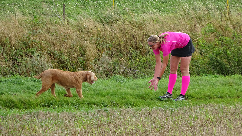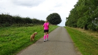 Zo mijmerend hobbel ik door. Het valt me niet mee maar dat hoeft ook niet tijdens een run. Ik ga straks S. ergens zien. Hij zal de vlag van de doggyride omhoog houden en dat blijkt een gouden greep. Ik herken hem heel makkelijk! Ik pak snel tijdens het lopen de spons, wis mijn gezicht even en loop door. S. rent daarbij met me mee.