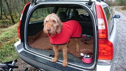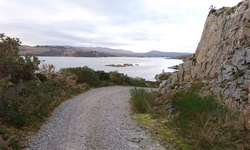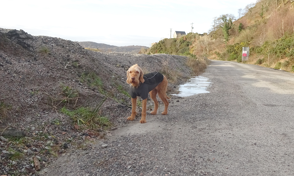 Bij de boerderij rennen drie honden op ons af. Op ons geroep naar de blaffende dieren komt de eigenaar naar buiten om ze weer bij zich te roepen. Gelukkig gebeurt er niks. We kunnen verder en genieten van het uitzicht. We zijn eigenlijk net iets te vroeg, want de zon zal iets later pas boven de heuvel achter ons uitkomen en het strandje in het zonnetje zetten. Misschien zien we dat straks nog. We maken een kiekje van wafje op weg naar het strandje.