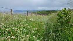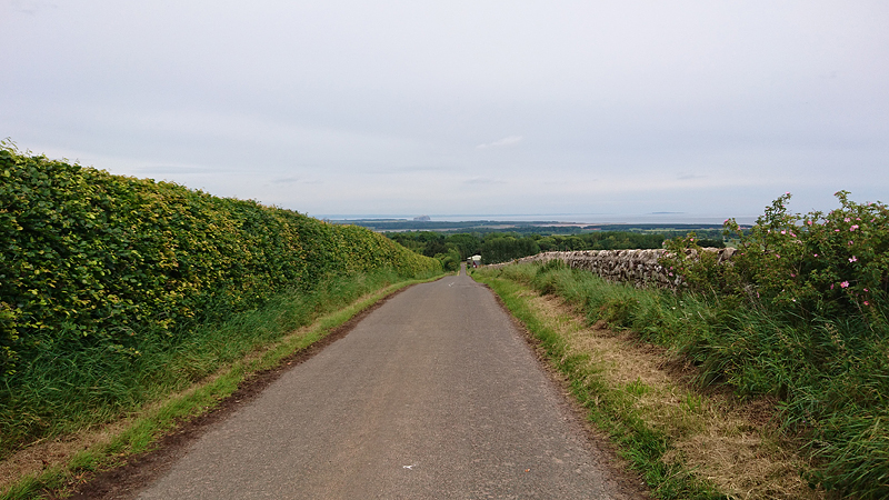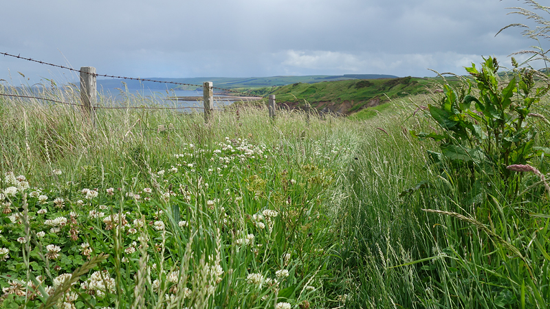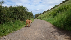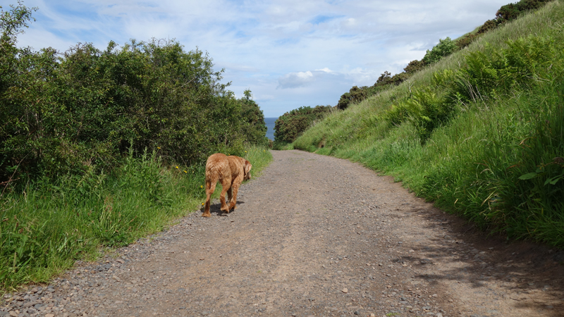 We lopen even langs de weg St Abbs weer uit maar al snel slaan we rechtsaf. Inmiddels is het weer bloed heet. Ik kijk voor me uit en zie een totaal open vlakte met heuvels. Dit lijkt me niet goed voor woef maar ik besluit een klein stukje door te lopen voor een uitzichts punt.