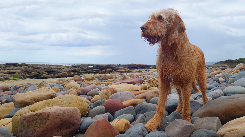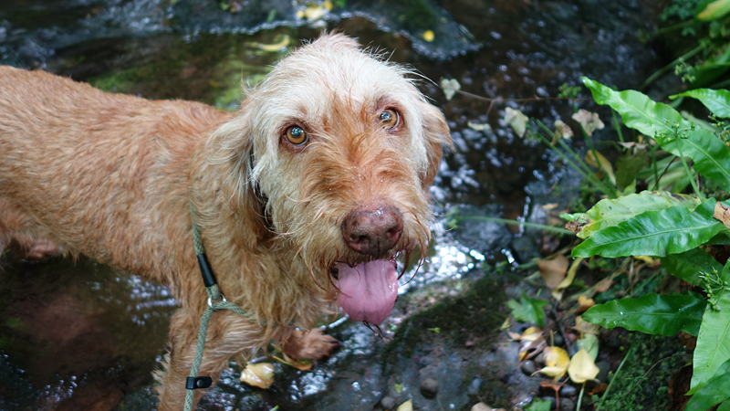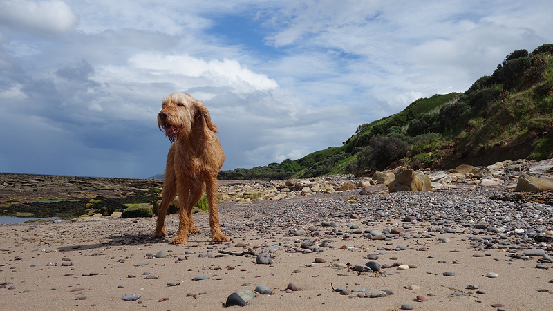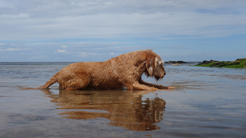We hobbelen verder en komen alweer bij een baaitje uit waar woef even kan badderen. Ze heeft dit vandaag ook echt nodig want het is 25 graden met volle zon.
