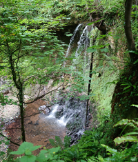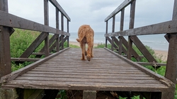 Het lopen gaat prima. Voordat ik er erg in heb, zijn we alweer langs de akker gelopen en steken we het bruggetje weer over waar wafje kan badderen en kan drinken. Ik vul toch maar voor de zekerheid even haar softflaskje met water uit de beek, anders heb ik straks misschien te weinig. Ik zie ook weer het strandje in de diepte liggen waar we nu eerst naartoe gaan. Ik moet nodig plassen en ga maar gewoon midden op het pad zitten. Omdat ik net hoog was, kon ik zien dat er niemand van beide kanten aan kwam…..