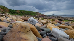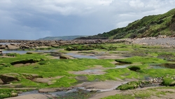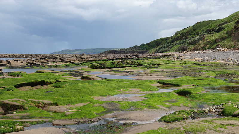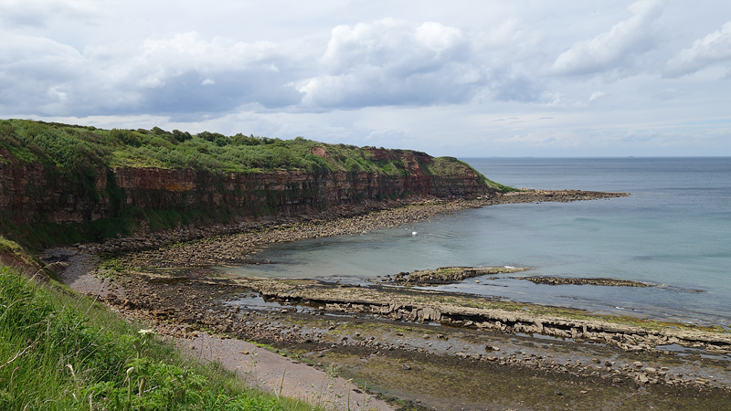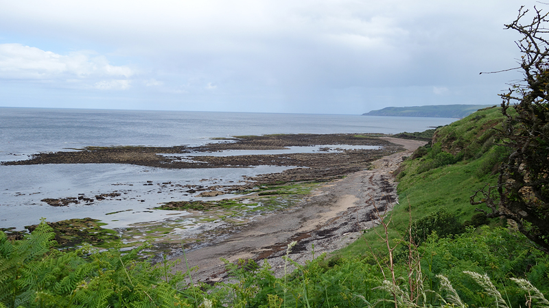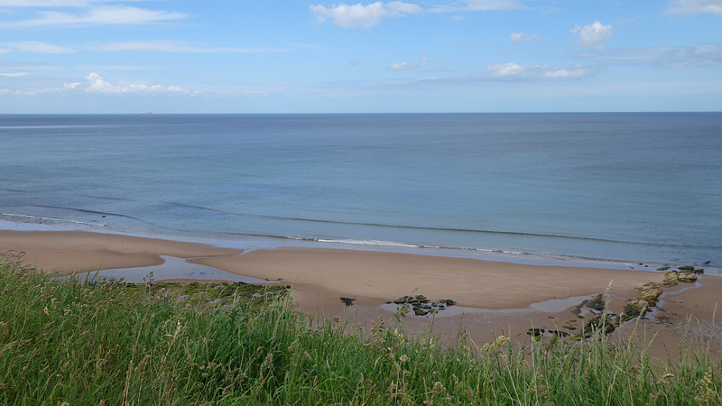We lopen door naar het eerste strandje en omdat het daar druk is, lopen we even door en gaan niet naar de water rand. Daarna hobbelen we weer de treetjes af naar het strandje naar Coldingham Bay.