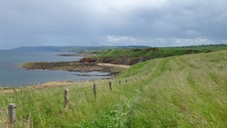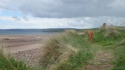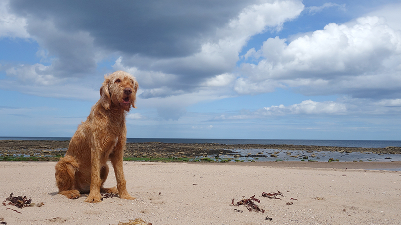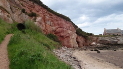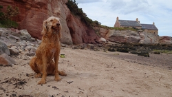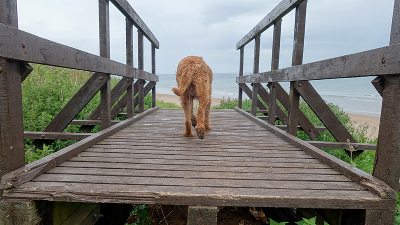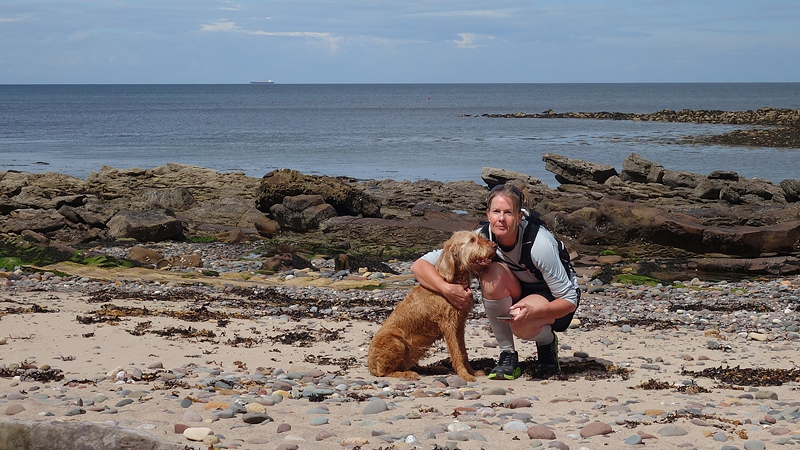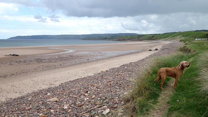 Al snel lopen wafje en ik weg van st abbs. Onze eerste stop zal nu het strandje bij Coldingham bay zijn waar ze even kan badderen. Na wat klimmetjes en afdalingen staan we bij het strand waar het nu nog heel rustig is. Ideaal. Wafje gaat even als zeehond in het water liggen en ik wacht dus even af en kijk om me heen. Er zijn al wat kinderen aan het spelen bij de gekleurde strandhuisjes. Verderop zie ik de route omhoog slingeren over een pad met treden. Ik ben benieuwd.