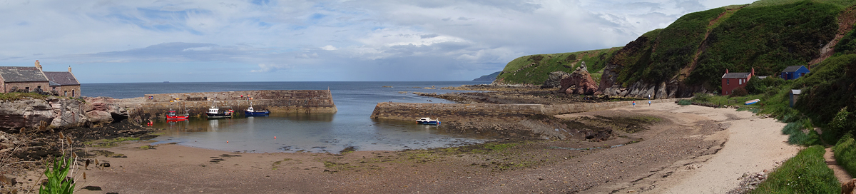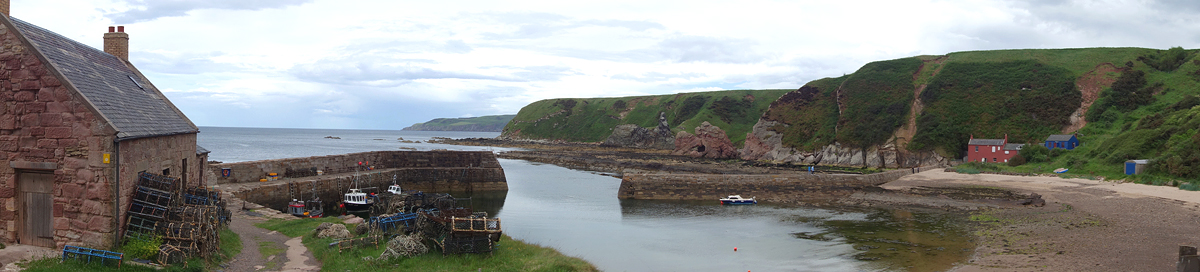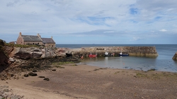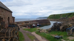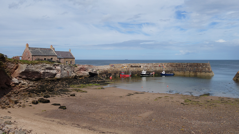 Ik wandel eerst even door het haventje om te kijken en vast wat foto’s te maken. Het is heel pittoresk en heel engels. Geweldig. Als ik langs het café loop, zit de vrouw van de rugzak daar en we raken even aan de praat. Zij wandelt veel en kent de route. Vandaag doet ze iets anders maar ze sliep bij st abbs head. Tsja dat snap ik. Dat had ik ook gewild, lijkt me geweldig.