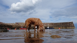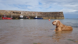 De terugweg gaat prima. Onderweg praat ik nog even met twee Nederlanders die net zijn aangekomen en op weg naar Edinburgh zijn. Hoewel de man een vogel liefhebber is, luister hij niet naar mijn suggesties over Isle of May voor de puffins. Dan maar niet toch! Wafje en ik hobbelen weer verder. Het eerste stuk is heerlijk bergaf nu naar het baaitje waar wafje nog een laatste keer kan afkoelen. Daarna weer verder. Ik zie St Abbs al liggen. Grappig genoeg hoor ik ineens de scheepshoorn van het cruise schip. De boot vertrekt!