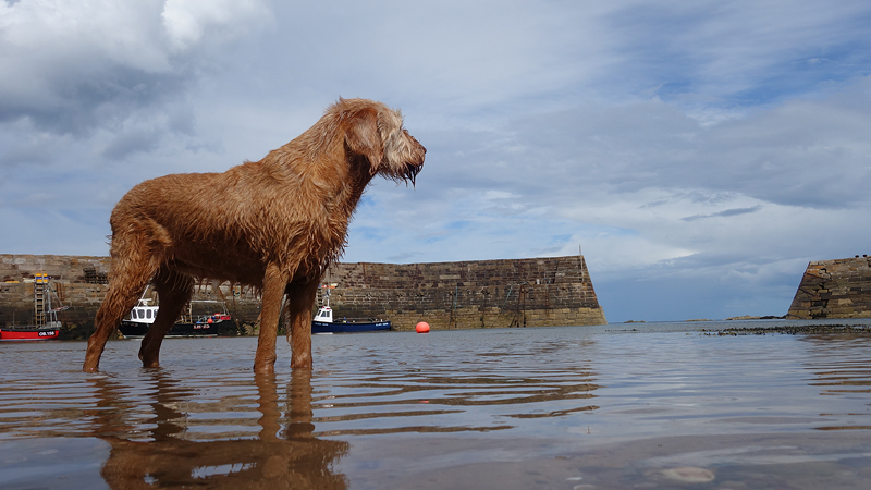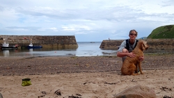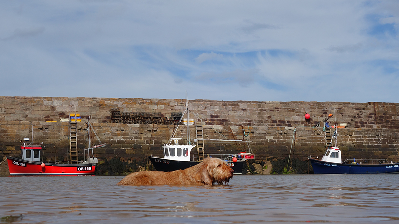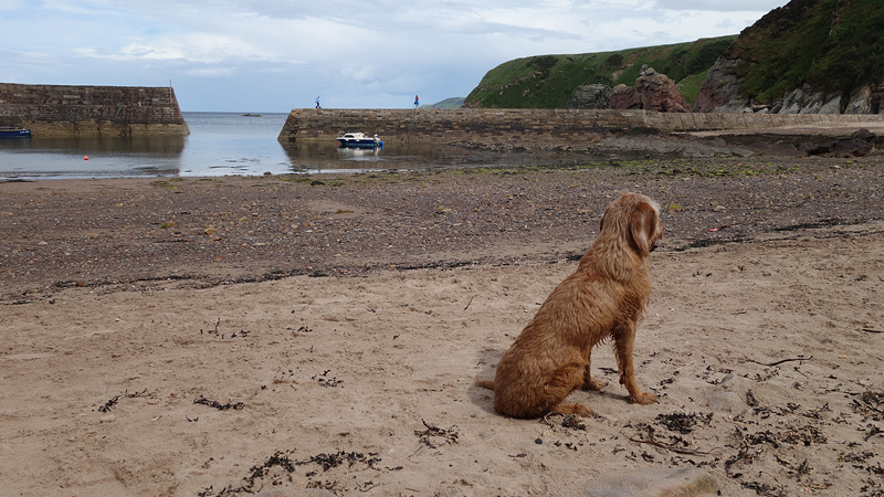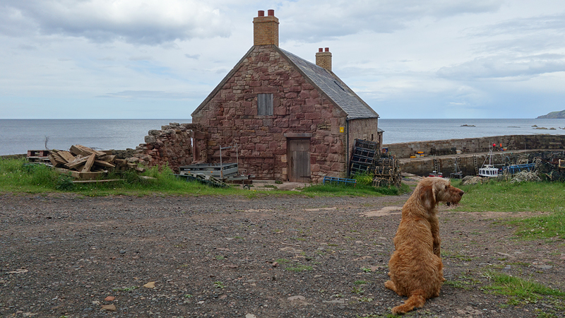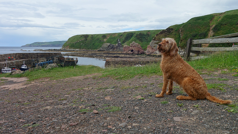 Als we wat zijn uitgerust gaan we weer op pad. Ik moet even zoeken naar de route want ik kan vanaf het strand de trap niet vinden maar een aardige dame wijst me de weg. Wafje klimt braaf de trappen op. Vanaf daar is het nog maar een heel klein stukje voordat we alweer uitzicht hebben over St Abb en het haventje.