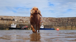 Ik kom uiteindelijk beneden bij het strand in het dorpje uit. Waf rent meteen naar de waterkant en gaat weer badderen natuurlijk. Ik wacht even af en daarna loop ik met haar naar een ijs stalletje.