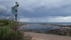 Ik heb steeds beter zicht op het schip. Dat is wel mooi! Ik zie inmiddels ook een caravan park bij Eyemouth. Iets gigantisch zo te zien en daar lopen we eerst omheen voordat we in het centrum aan zullen komen. Het is er vast druk met de mensen van het cruise schip.