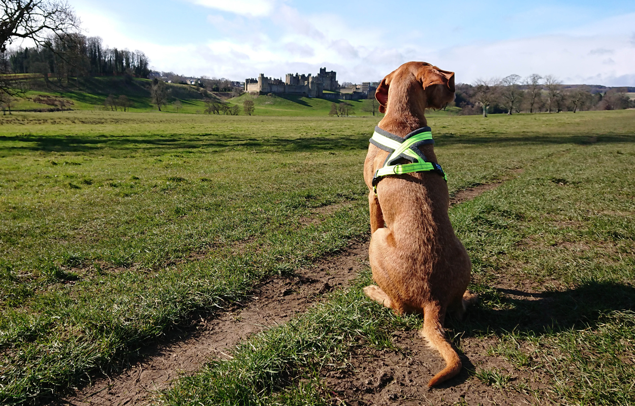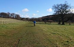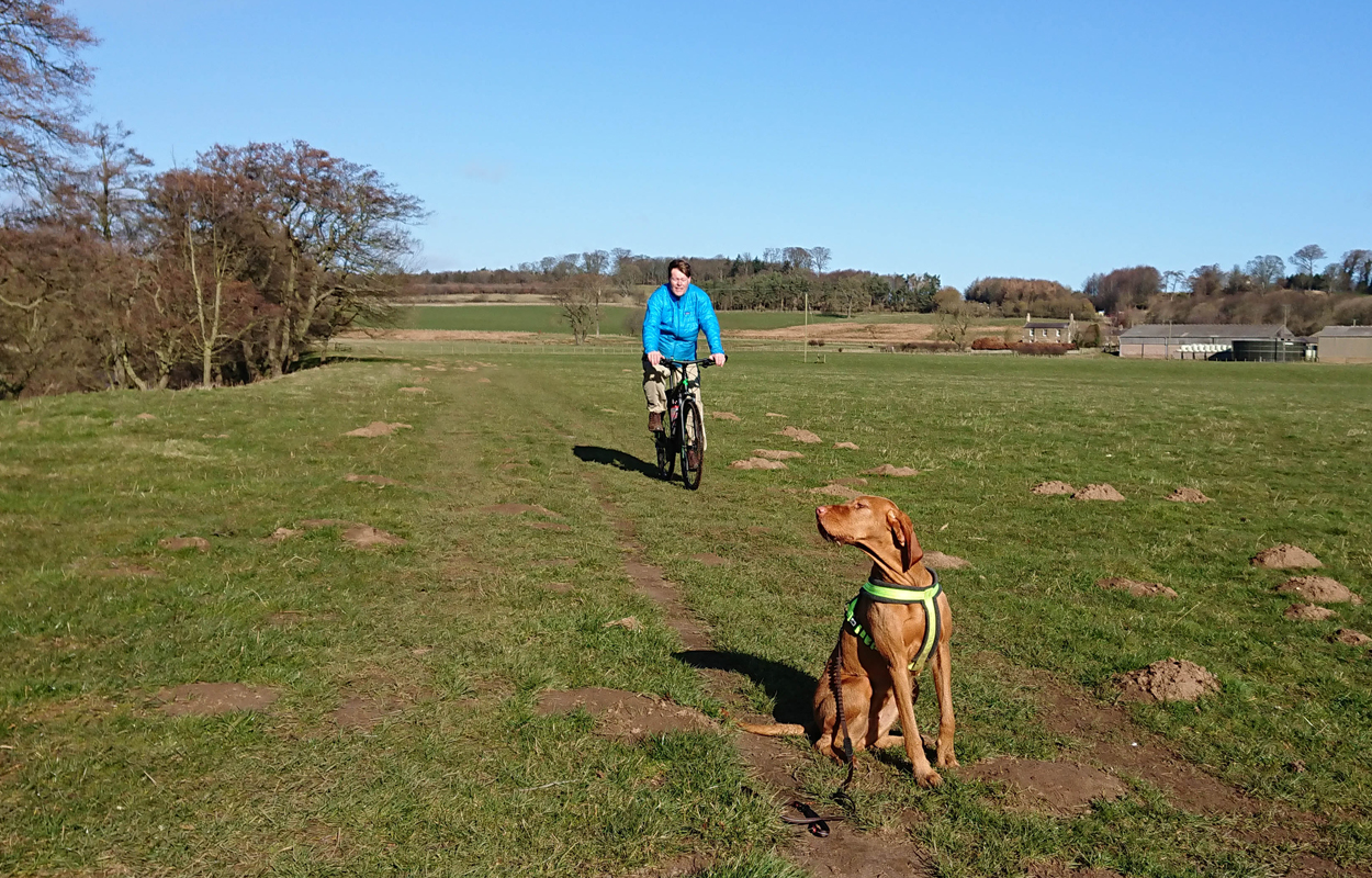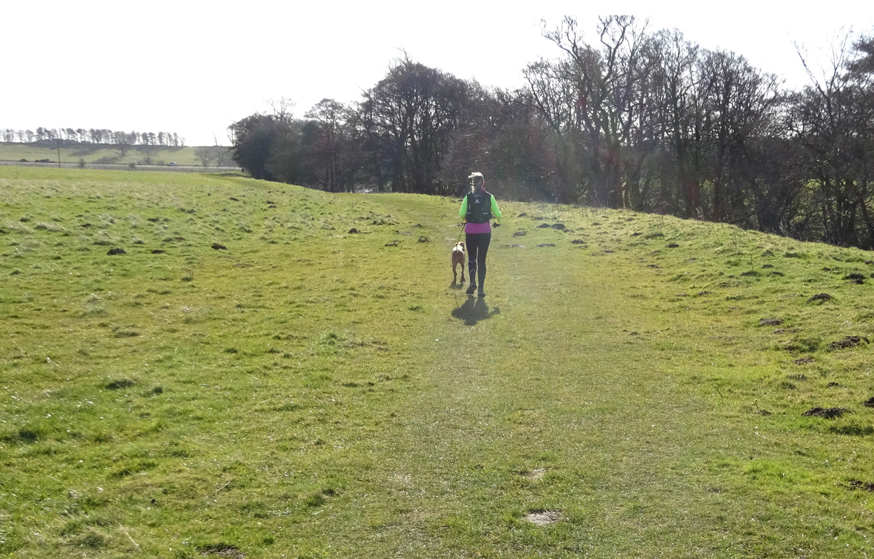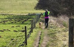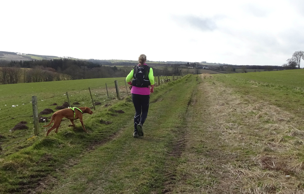 Na een tijdje ga ik weer verder met de route. Vanaf nu gaat het iets sneller denk ik hoewel er nog wel een lastig stukje aan gaat komen maar misschien valt het mee. Er komt nog wel een leuke uitdaging in de vorm van een muurtje met een lastige draad die eroverheen loopt. Ziva kon dat heel makkelijk ‘nemen’ maar Fleur heeft zoiets nog nooit gedaan natuurlijk. Maar zo ver is het nog niet. Eerst nog langs het bos lopen weer terug richting Swinhoe farm en daar over het terrein van de manege.
