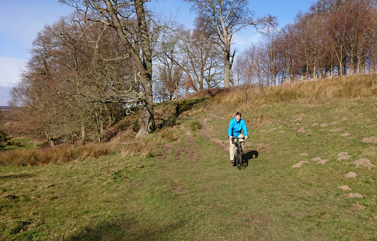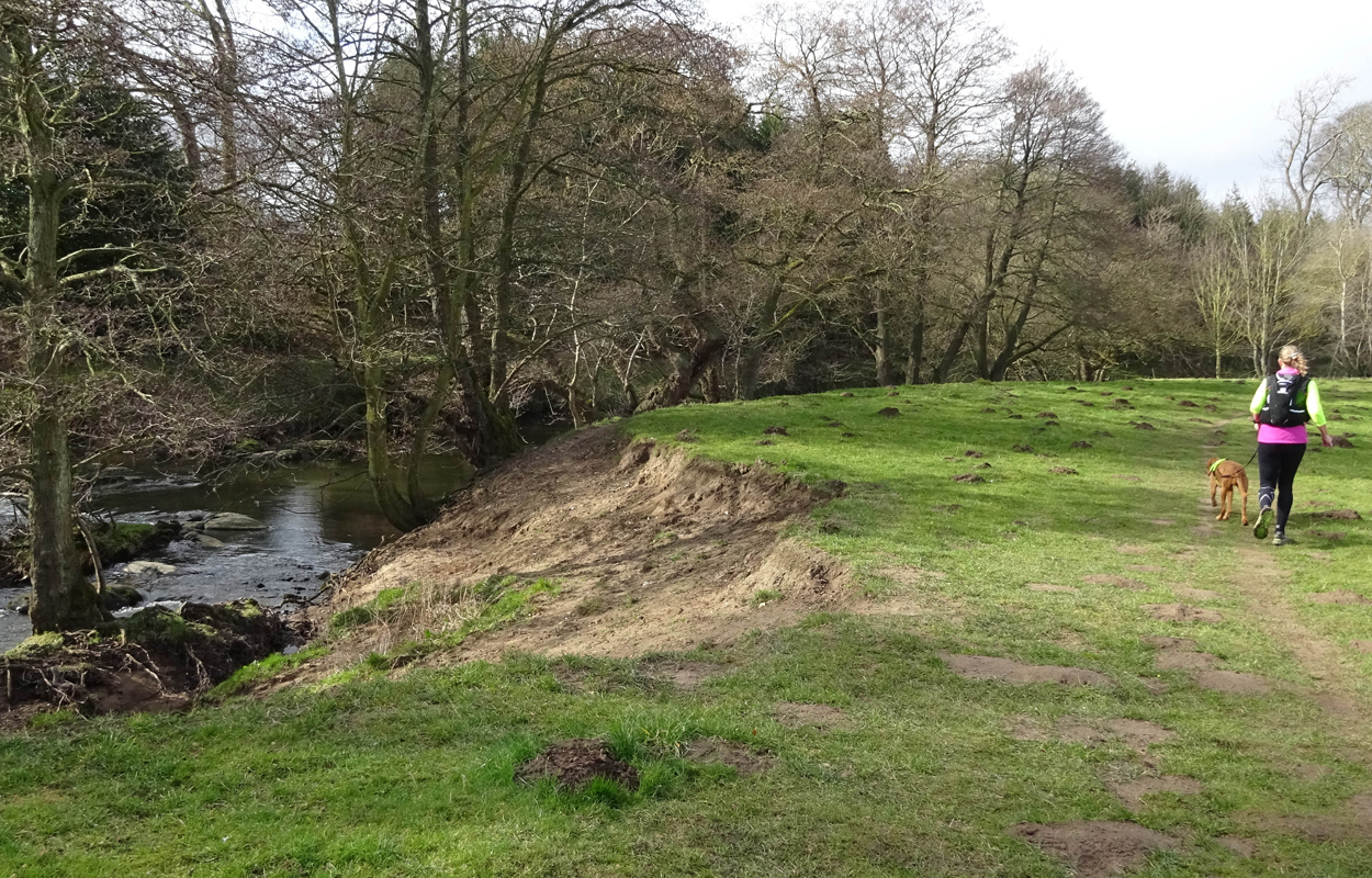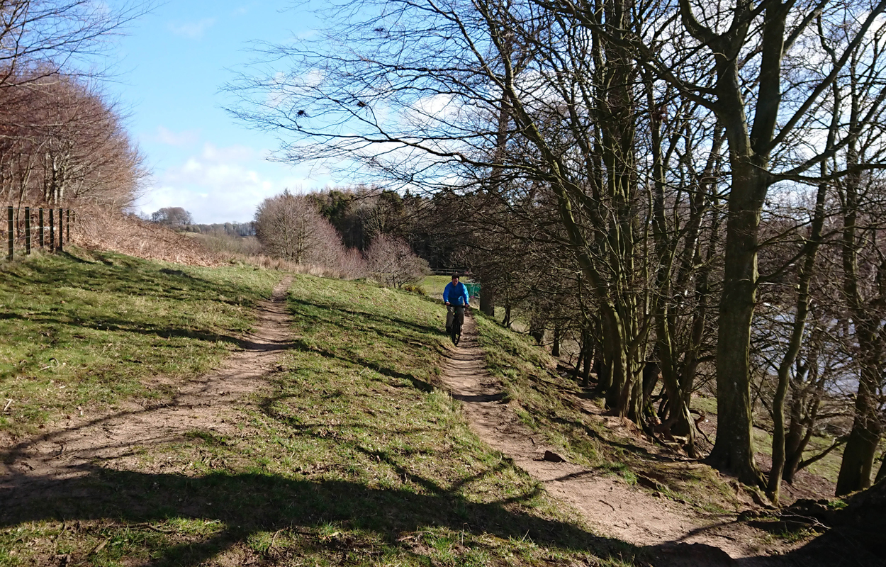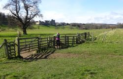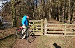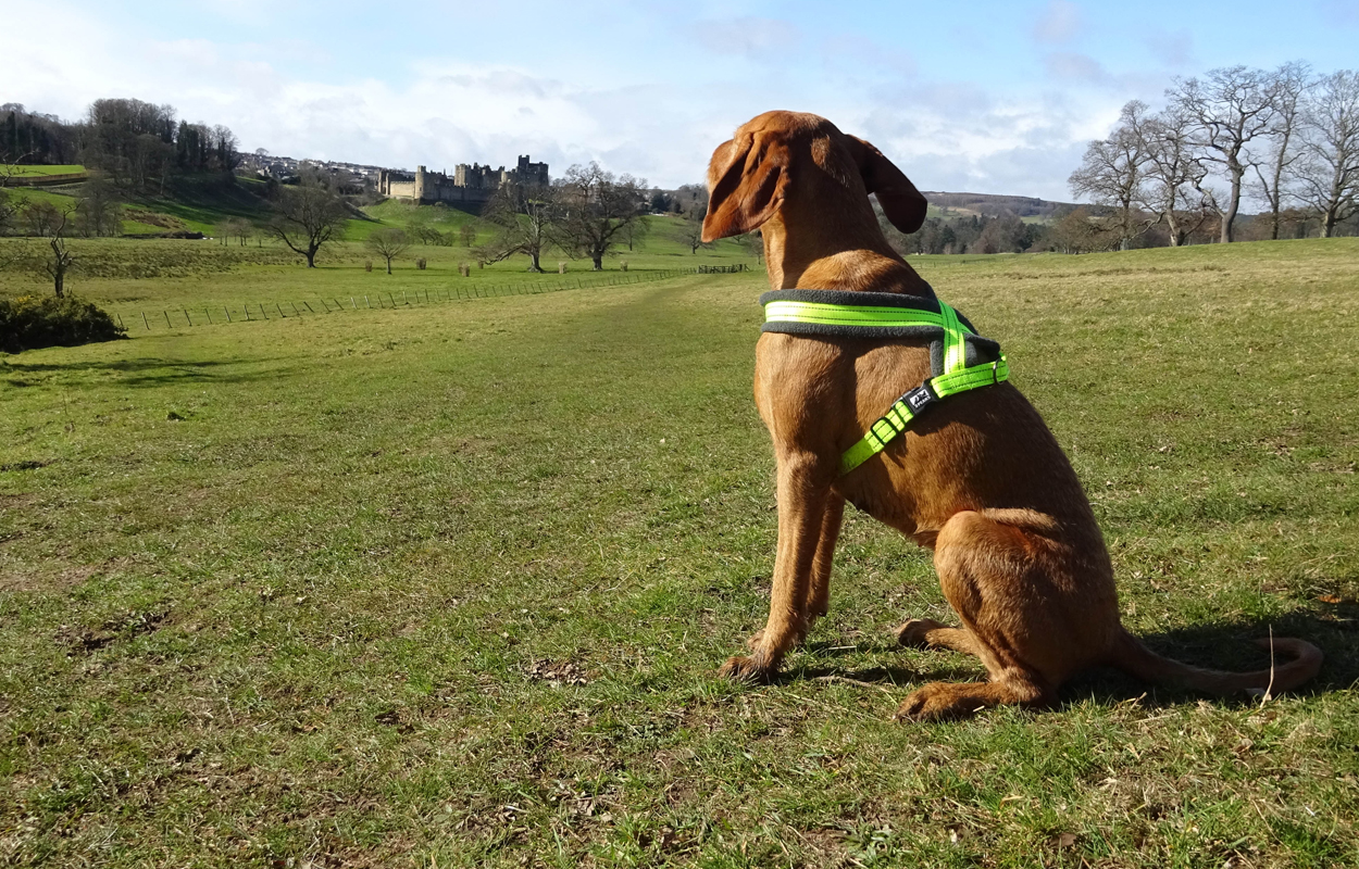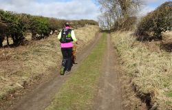 Na een tijdje ga ik weer verder met de route. Vanaf nu gaat het iets sneller denk ik hoewel er nog wel een lastig stukje aan gaat komen maar misschien valt het mee. Er komt nog wel een leuke uitdaging in de vorm van een muurtje met een lastige draad die eroverheen loopt. Ziva kon dat heel makkelijk ‘nemen’ maar Fleur heeft zoiets nog nooit gedaan natuurlijk. Maar zo ver is het nog niet. Eerst nog langs het bos lopen weer terug richting Swinhoe farm en daar over het terrein van de manege.