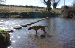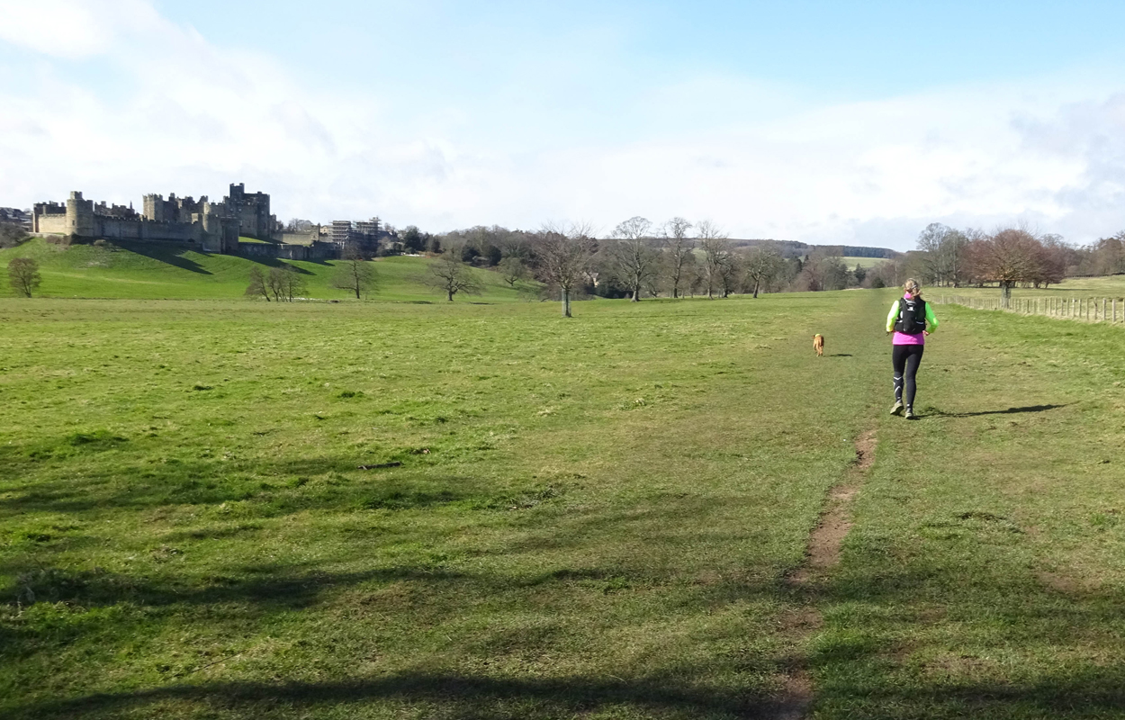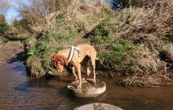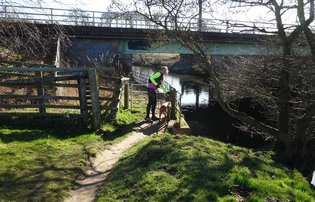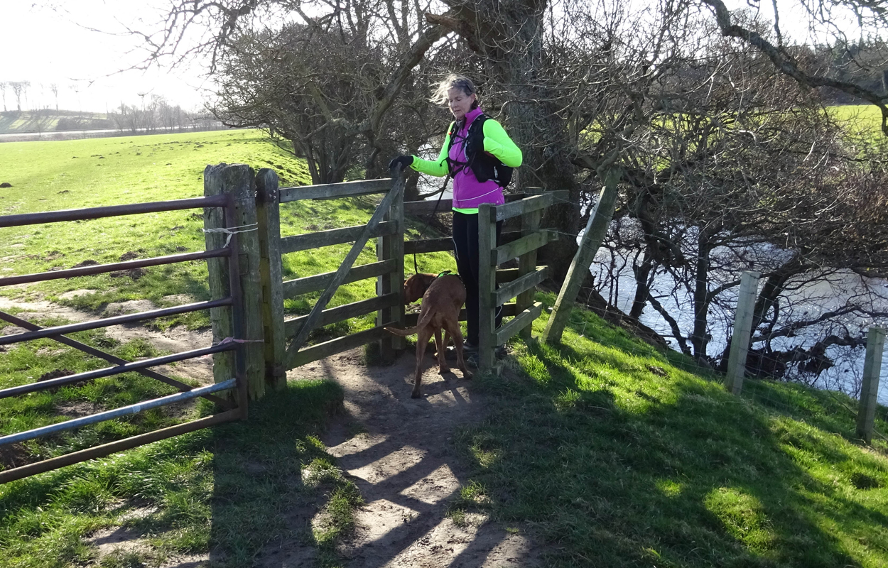 Het laatste stukje gaat snel en inmiddels is S. inderdaad al bij de farmshop aangekomen. Daar gaan we straks dus ook heen. Ik hobbel het laatste stukje over het weiland, ga nog even kijken of Fleur wat wil drinken bij het watertje (nee) en hobbel door het dorpje terug naar de auto. Dar wil ze gelukkig wel wat drinken.