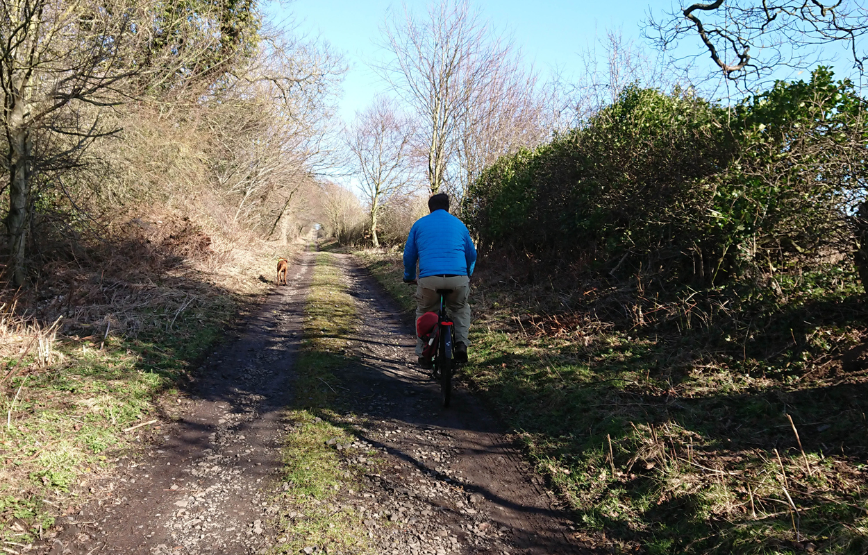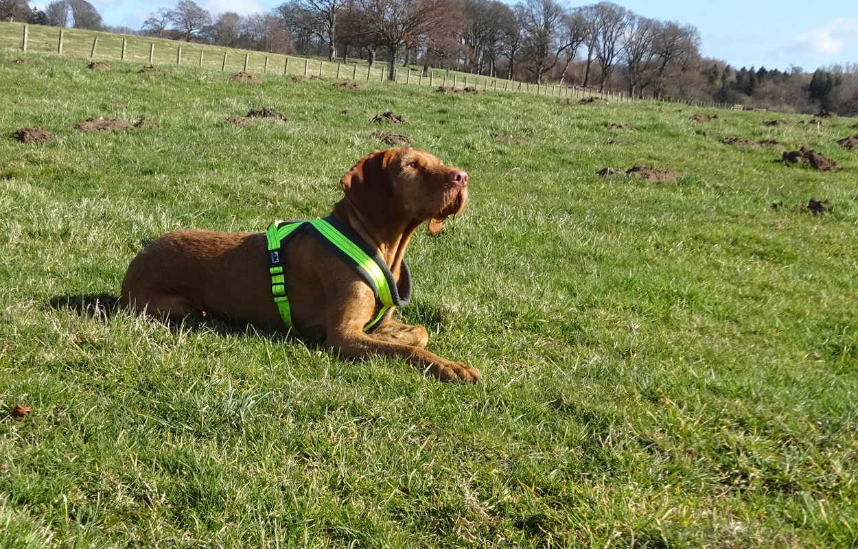 Aan het einde van het veld gaan we weer door een hekje en lopen we door het bos. Ze moet hier eigenlijk aan de riem maar dat is vooral vanwege de fazanten die hier gekweekt worden voor de jacht. Beetje rare bedoening. Ik hoor nog niks dus vooruit maar… lekker even los dan maar en dat gaat goed. Het is wel leuk om na het weiland even door het bos te hobbelen nu. Aan het einde van het bos lopen we weer richting een farm met een weg waar ik haar voor de zekerheid even aanlijn.