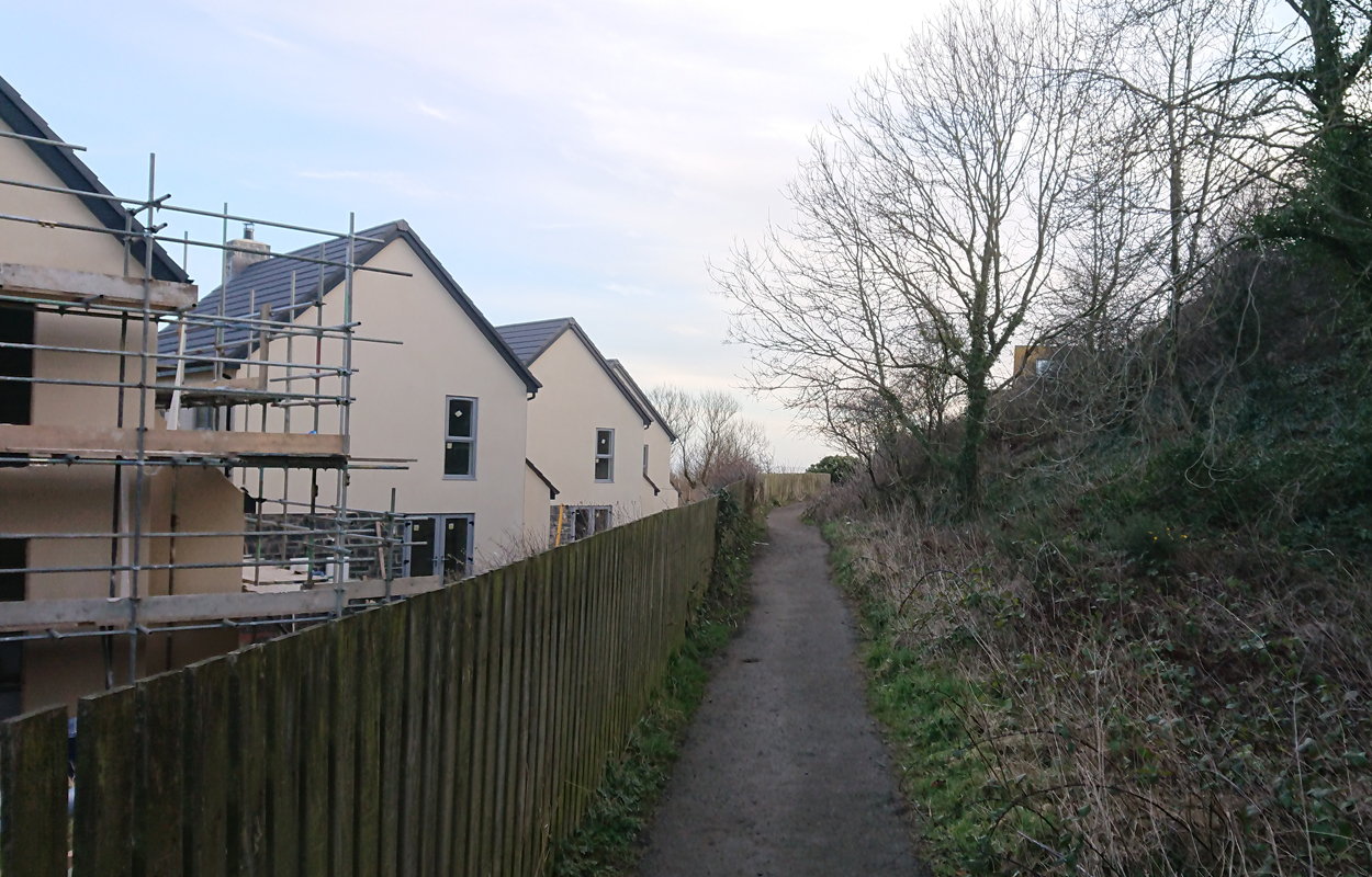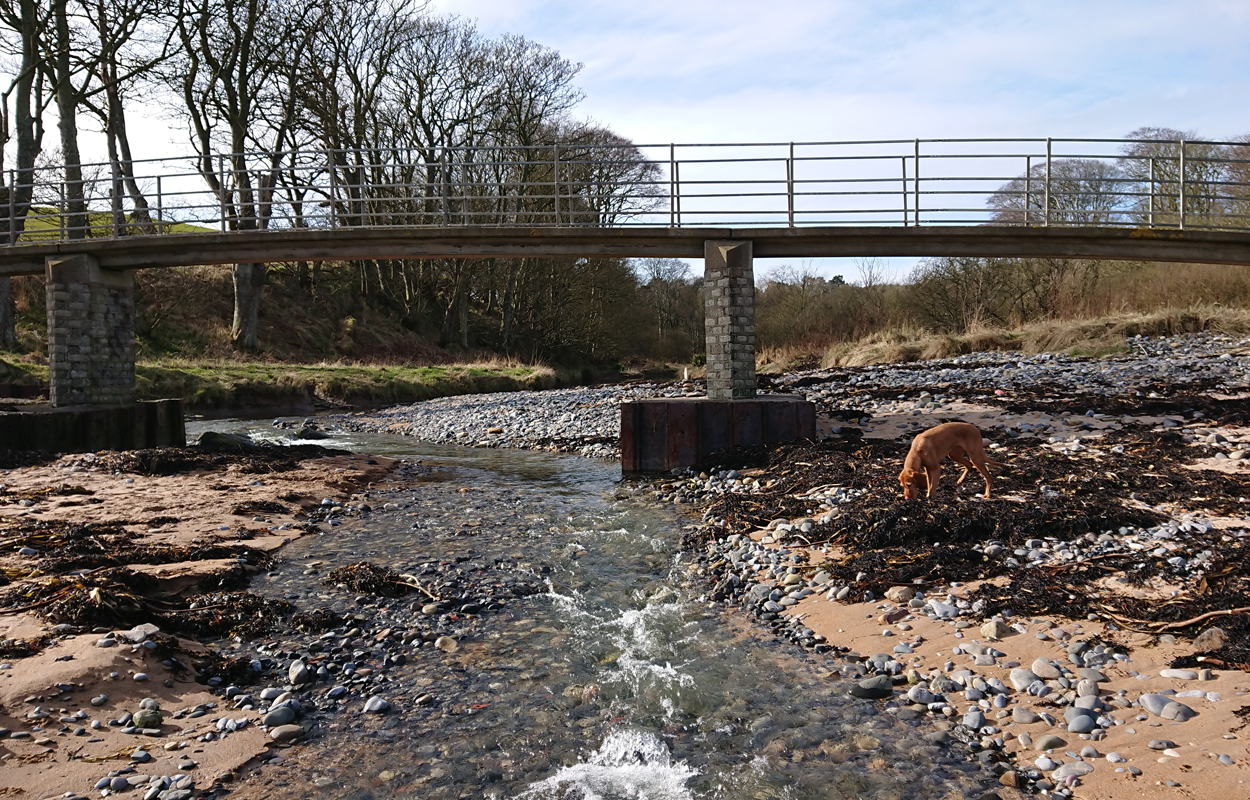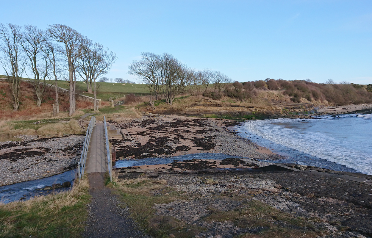Al snel zijn we weer over het weiland en lopen we alweer over de stoep richting de rotonde in Alnmouth terug naar de brug over het water. Ik kan de route dromen. Deze keer netjes over het pad langs de brug natuurlijk en ik maak een kiekje van het water. Daarna door het hekje richting de lovers lane met de gekleurde huisjes links en het uitzicht over het watertje. Ik heb het idee dat het weer straks nog wel eens zou kunnen opklaren eigenlijk.