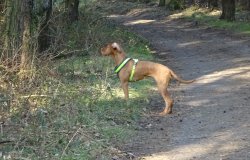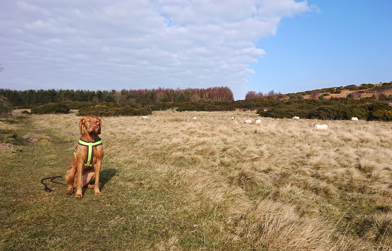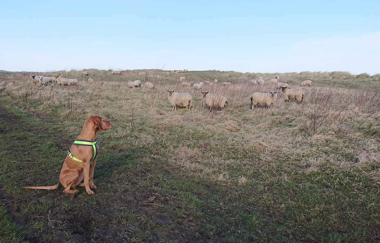 Vanaf het haventje weer naar de parkeerplaats en klimmen richting de golfbaan. Inmiddels is het druk met golfers dus opletten dat ik geen balletje tegen mijn kop aan krijg. Grappig genoeg wacht Fleur netjes totdat ik er ook ben als ik naar boven moet klimmen. Dat deed Ziva ook altijd! Kennelijk loopt Fleur inmiddels wel ‘met’ me.