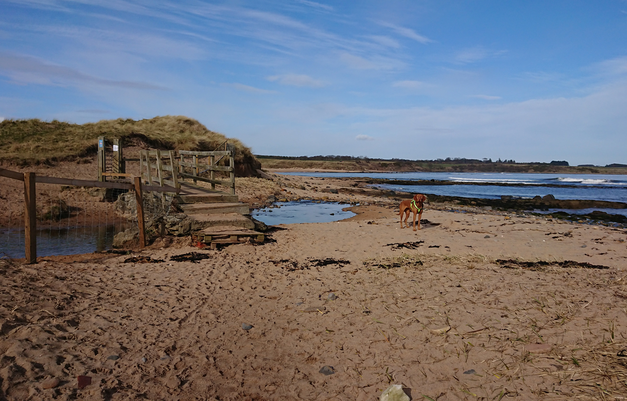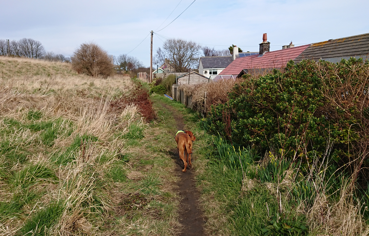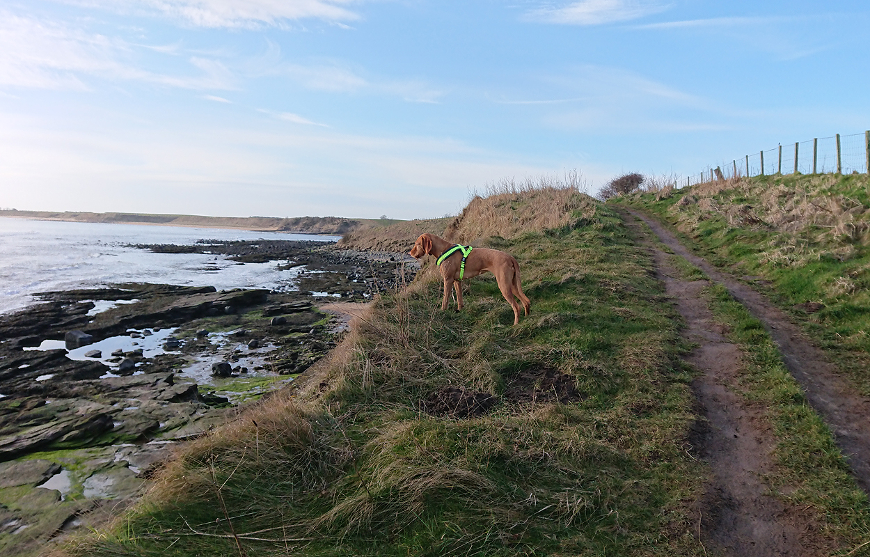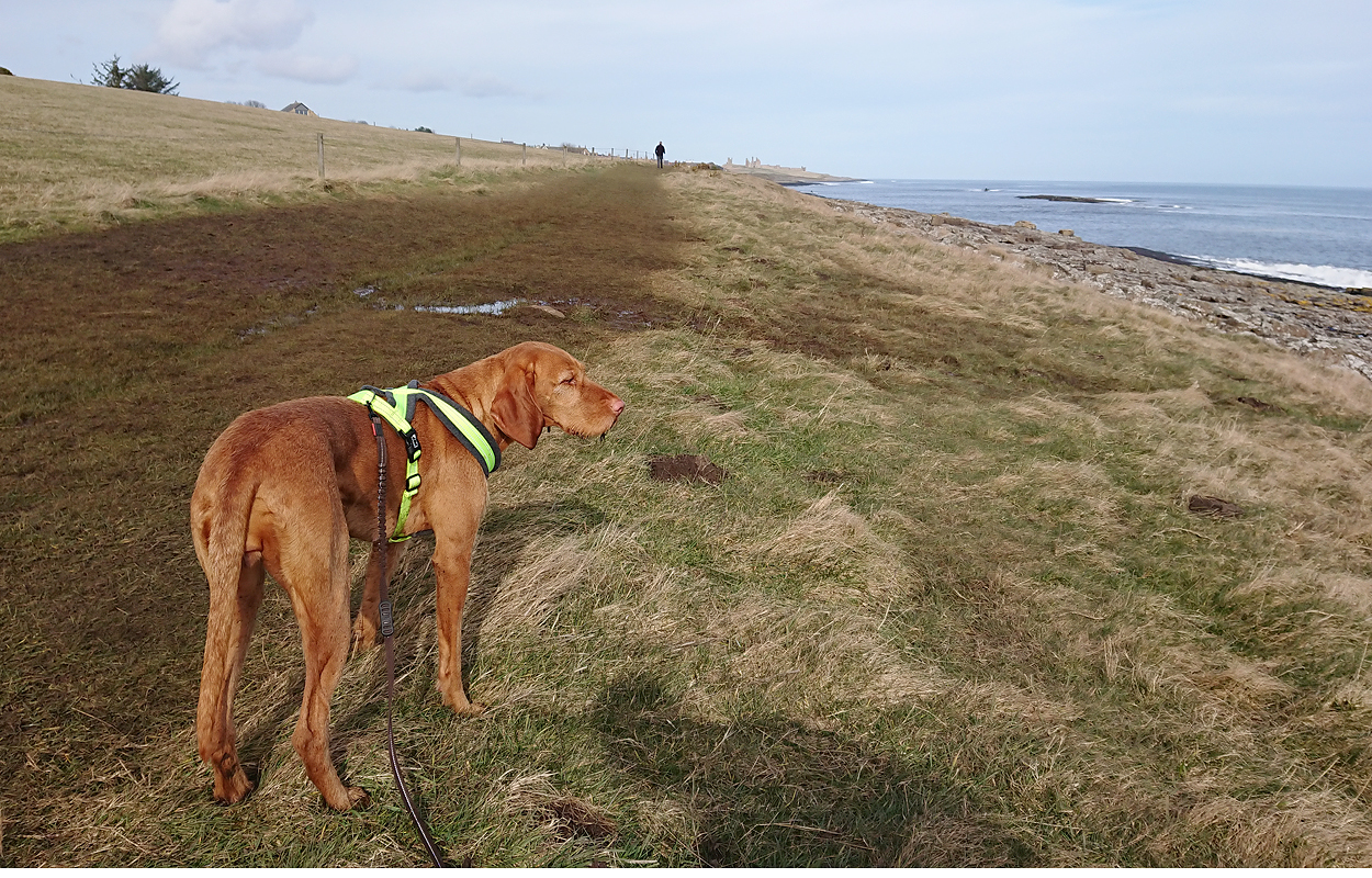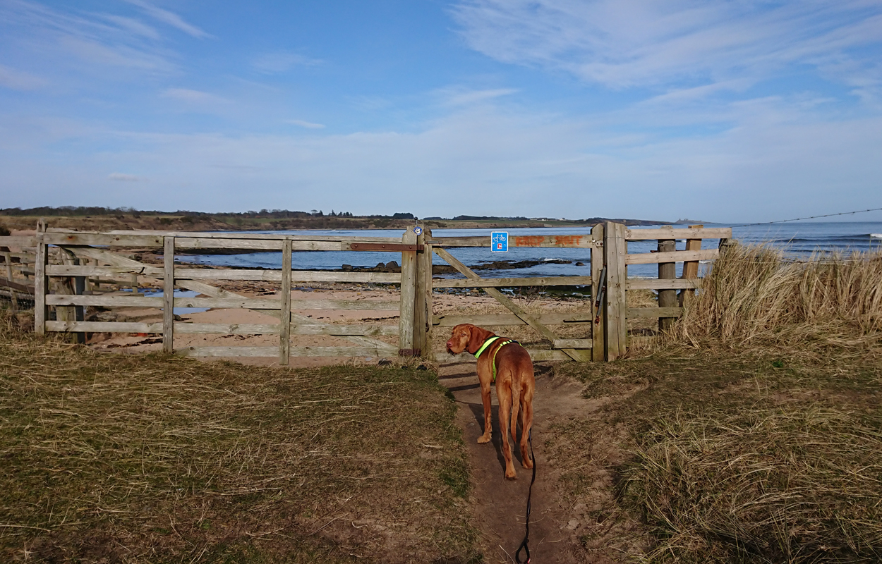 Ik hobbel over de golfbaan en neem het pad langs de golfbaan en langs de zee. Ik hou Fleur even aan de riem maar straks mag ze lekker los gelukkig. Al snel hobbelen we naar boven langs de bunker boven de parkeerplaats bij Alnmouth en naar beneden naar de parking aan zee.