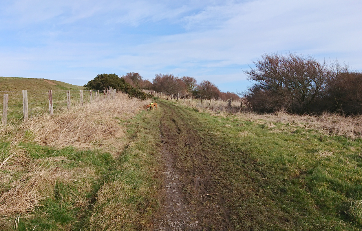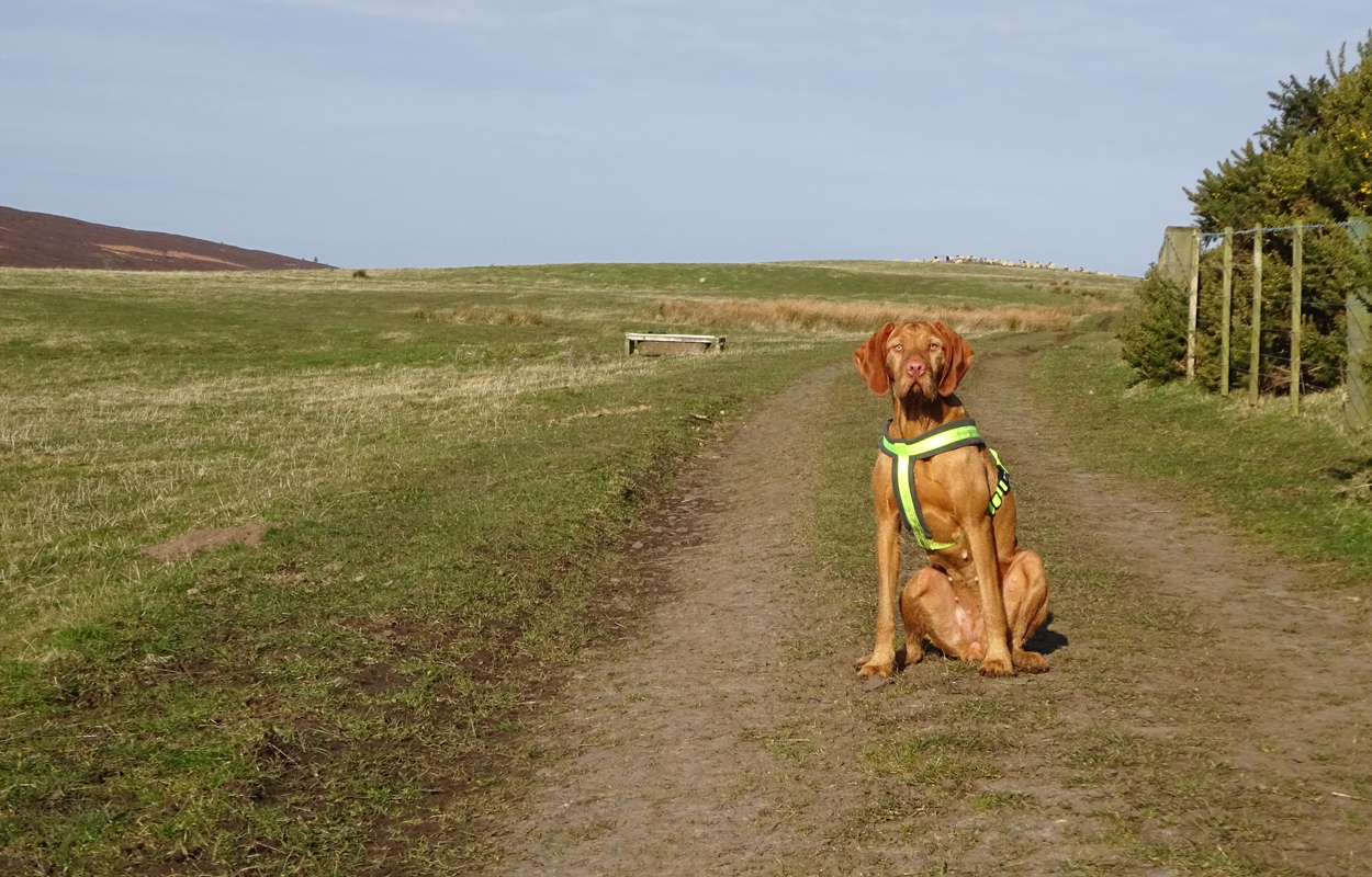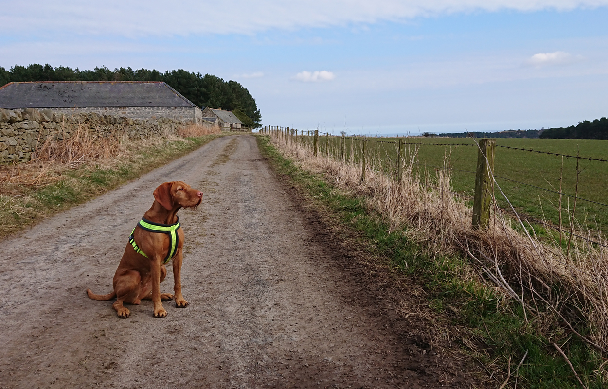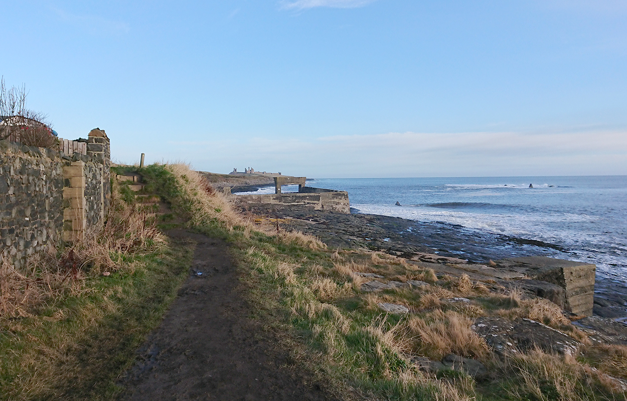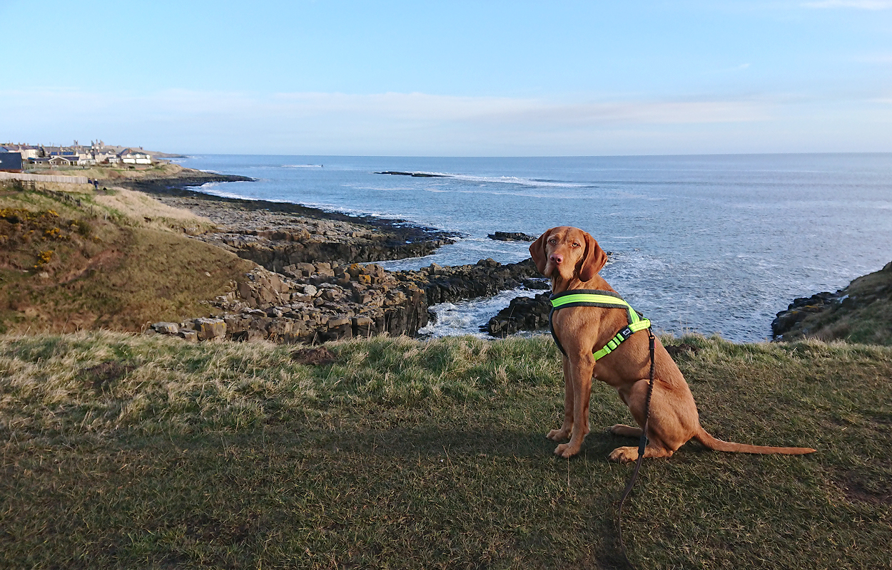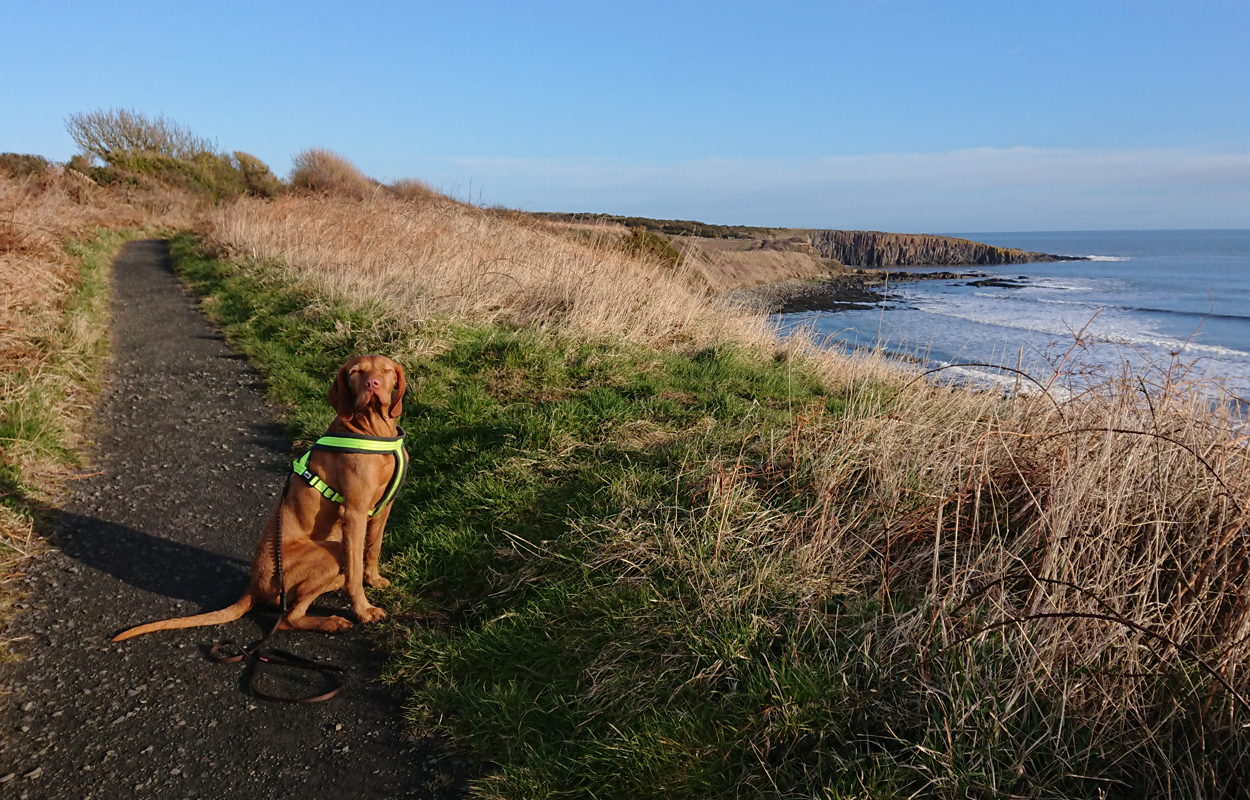 Ik hobbel over de golfbaan en neem het pad langs de golfbaan en langs de zee. Ik hou Fleur even aan de riem maar straks mag ze lekker los gelukkig. Al snel hobbelen we naar boven langs de bunker boven de parkeerplaats bij Alnmouth en naar beneden naar de parking aan zee.
