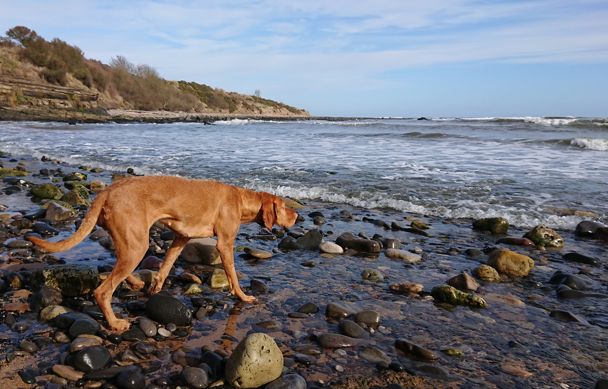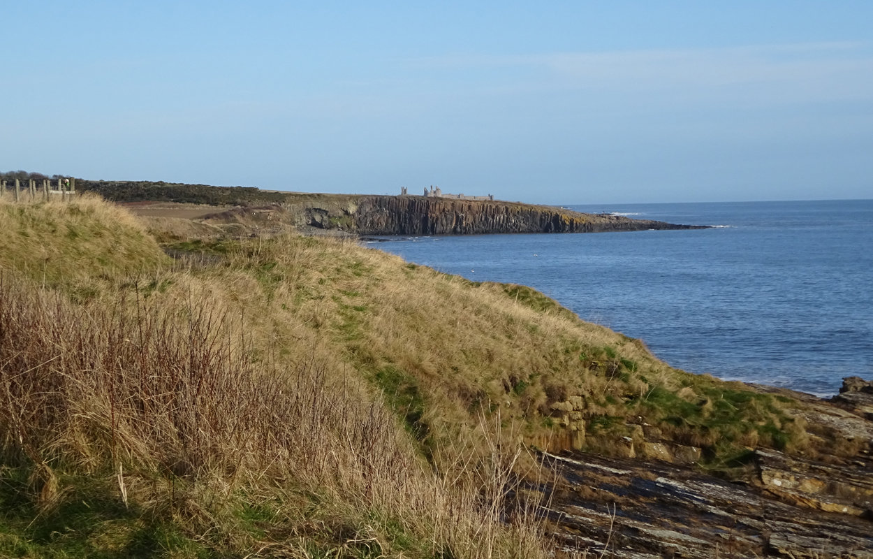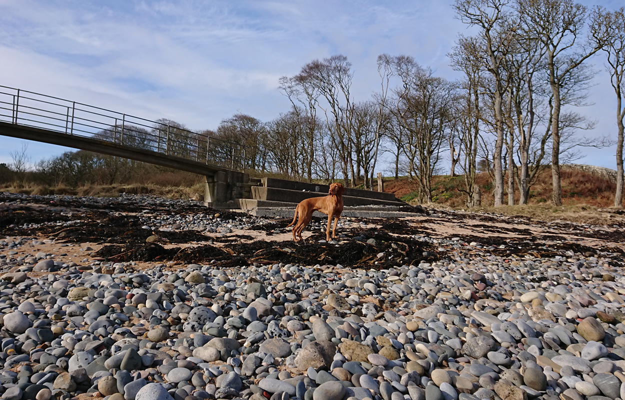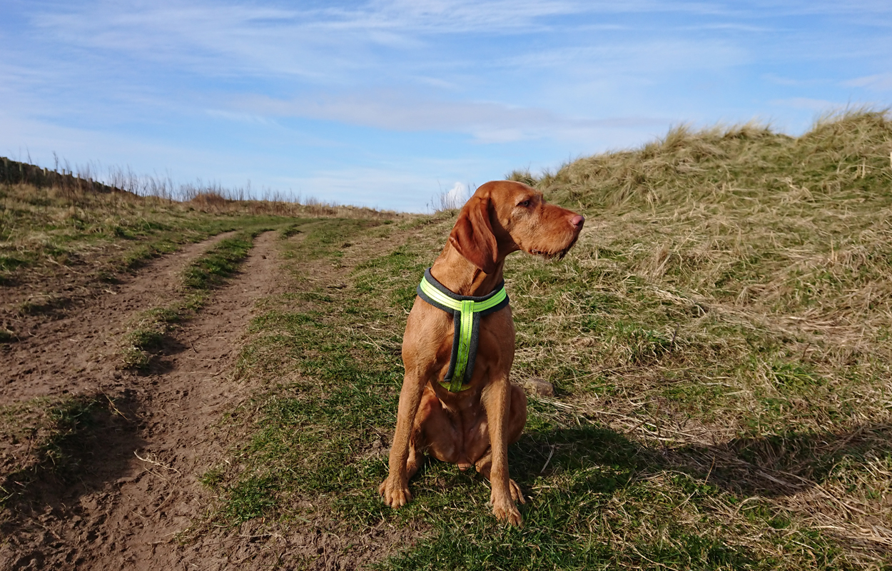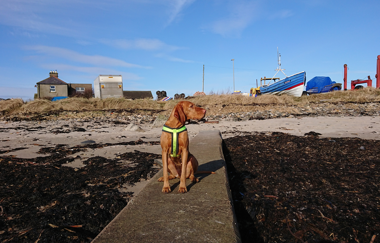 Ik hobbel over de golfbaan en neem het pad langs de golfbaan en langs de zee. Ik hou Fleur even aan de riem maar straks mag ze lekker los gelukkig. Al snel hobbelen we naar boven langs de bunker boven de parkeerplaats bij Alnmouth en naar beneden naar de parking aan zee.