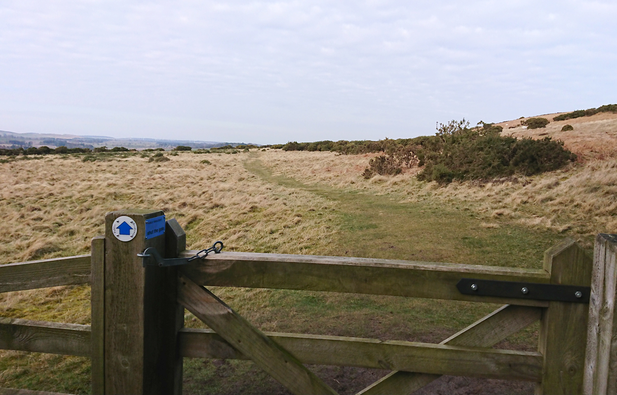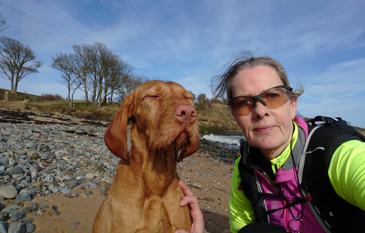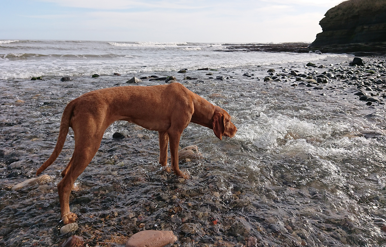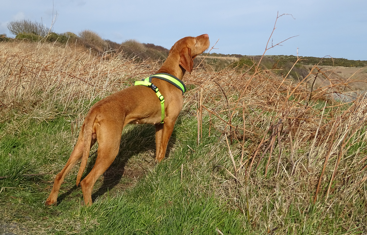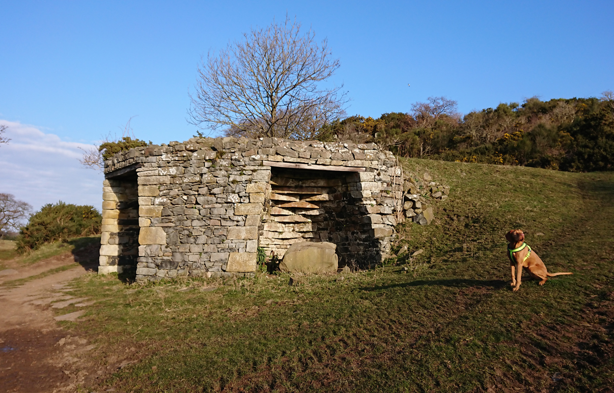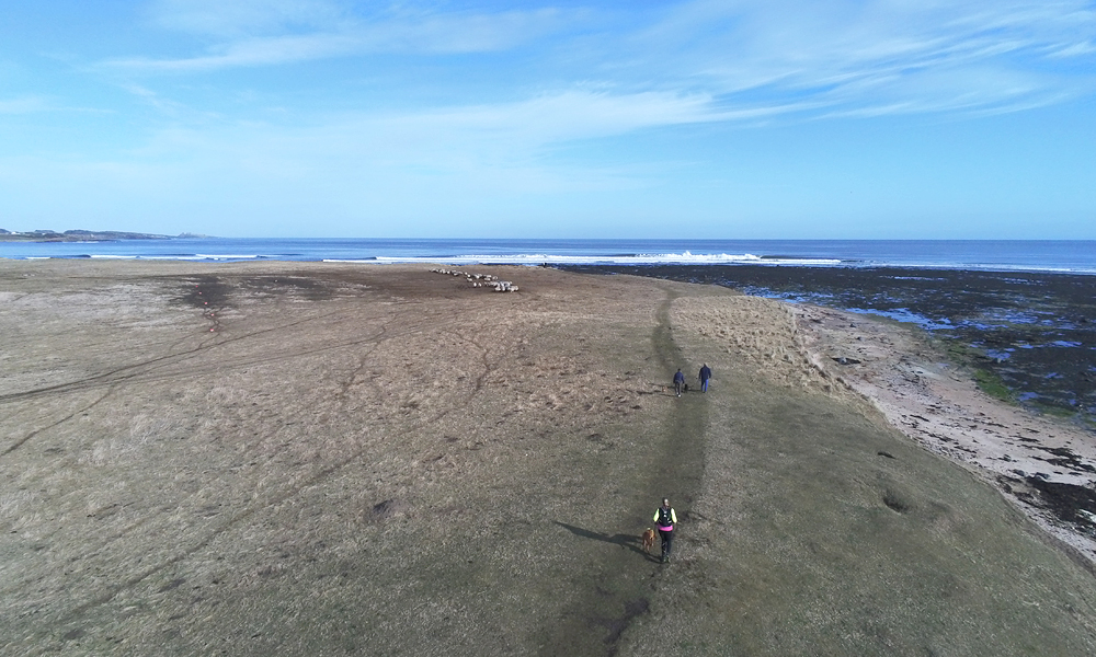 Ik hobbel over de golfbaan en neem het pad langs de golfbaan en langs de zee. Ik hou Fleur even aan de riem maar straks mag ze lekker los gelukkig. Al snel hobbelen we naar boven langs de bunker boven de parkeerplaats bij Alnmouth en naar beneden naar de parking aan zee.