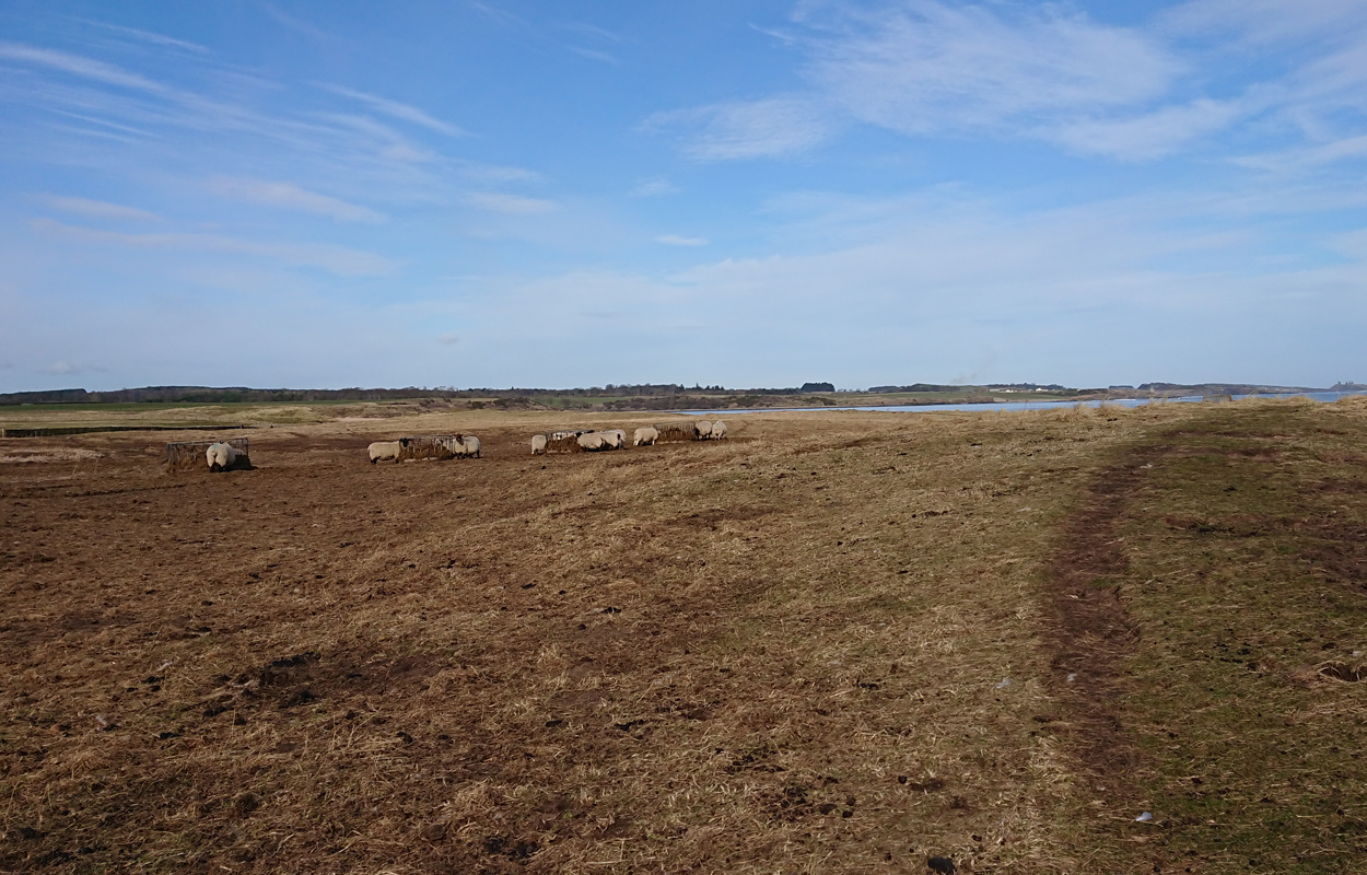 Op de parkeerplaats was tijdens de ultra een checkpoint. Nu komen de eerste honden uitlaters aanrijden en hobbel ik rustig verder via het dorpje naar de lovers lane bij het speelterreintje. Ik loop langs het haventje dat momenteel bijna droog ligt vanwege het lage water. Ik heb deze route wel eens gelopen met hoog water waardoor ik iet naar Alnmouth kon komen vanaf Boulmer. Daar is dus nu geen sprake van door het getijde. Wie weet kan ik straks verder lopen maar voorlopig is het nog even tegen de wind in boksen richting de stepping stones.